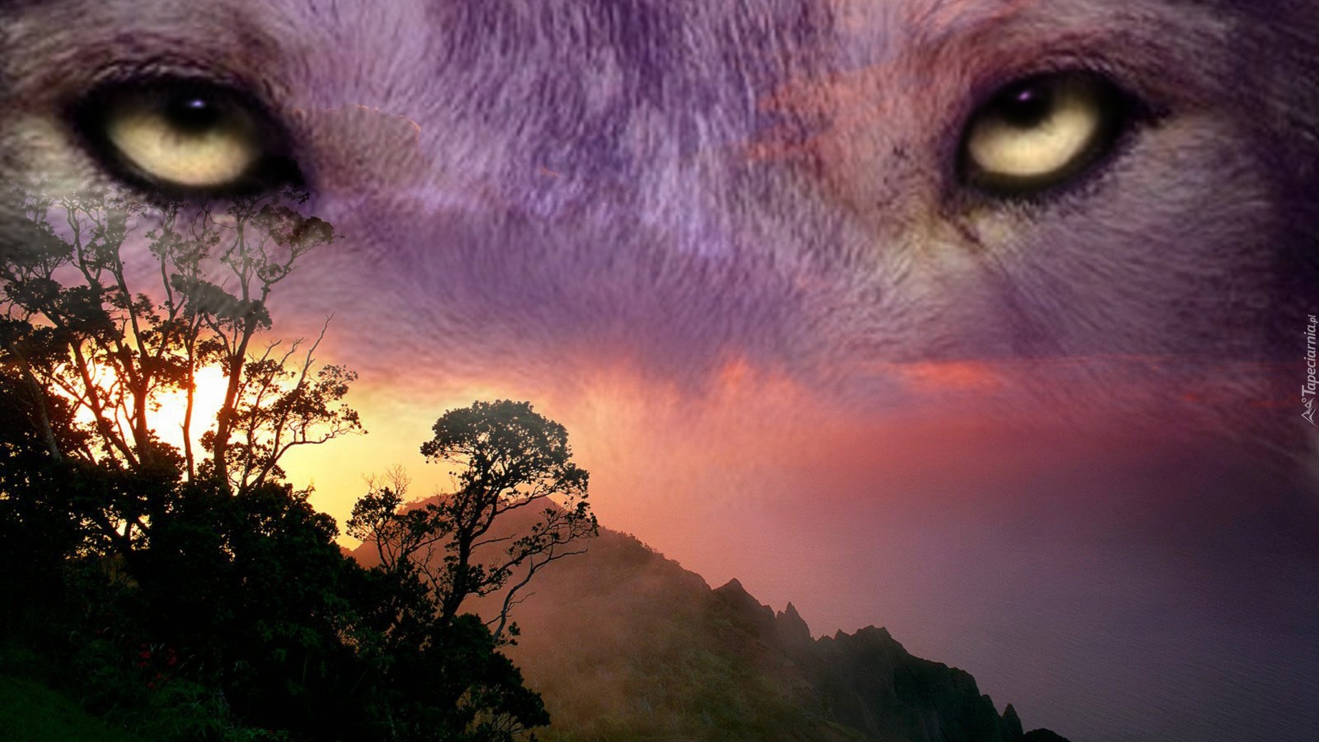 Edytor tapety: Oczy, Wilka, Góry, Zachód, Słońca