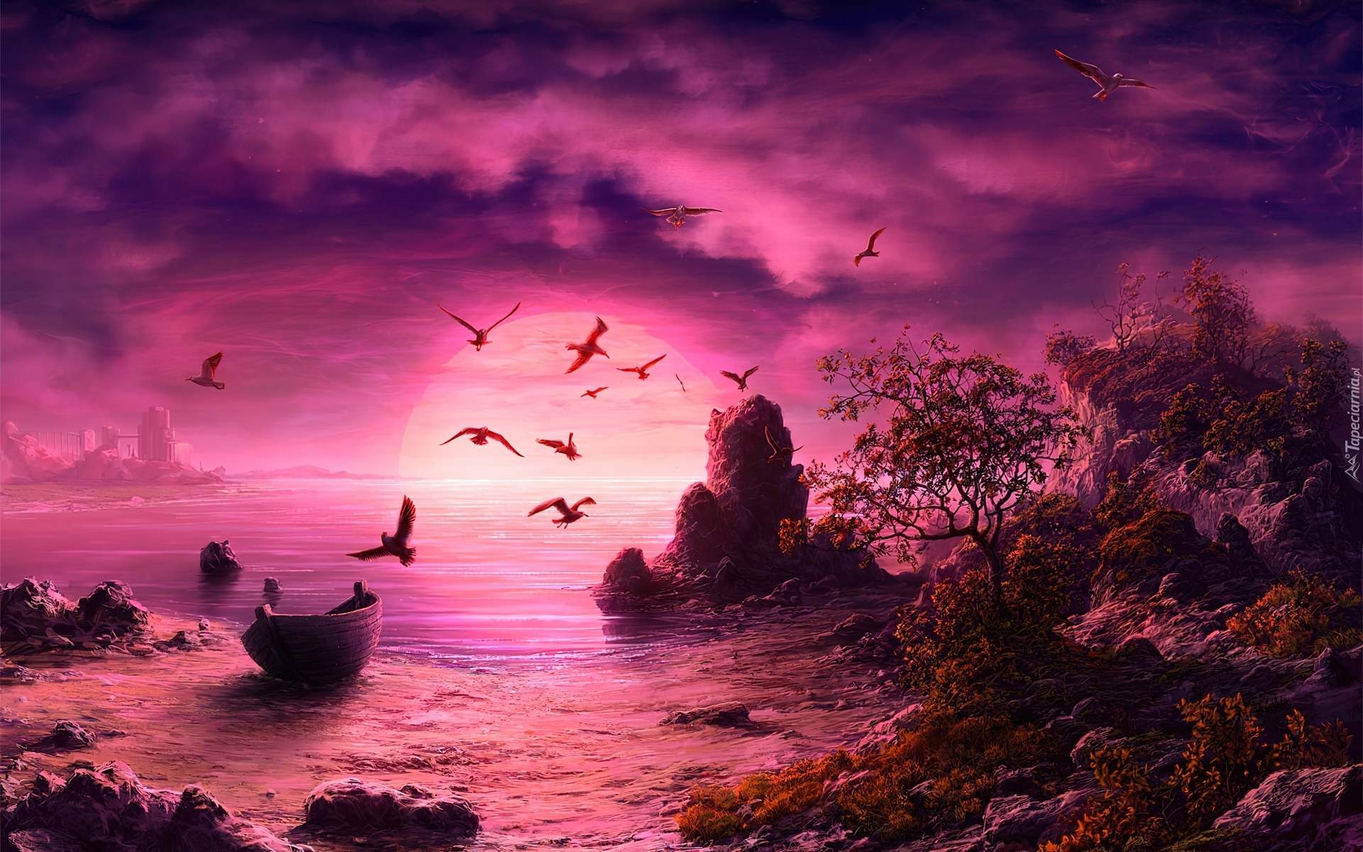 Edytor tapety: Zachód, Słońca, Plaża, Mewy