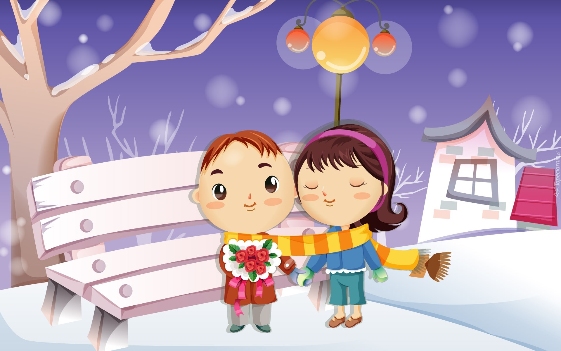 Edytor tapety: Para, Zakochany, Zima, Ławeczka