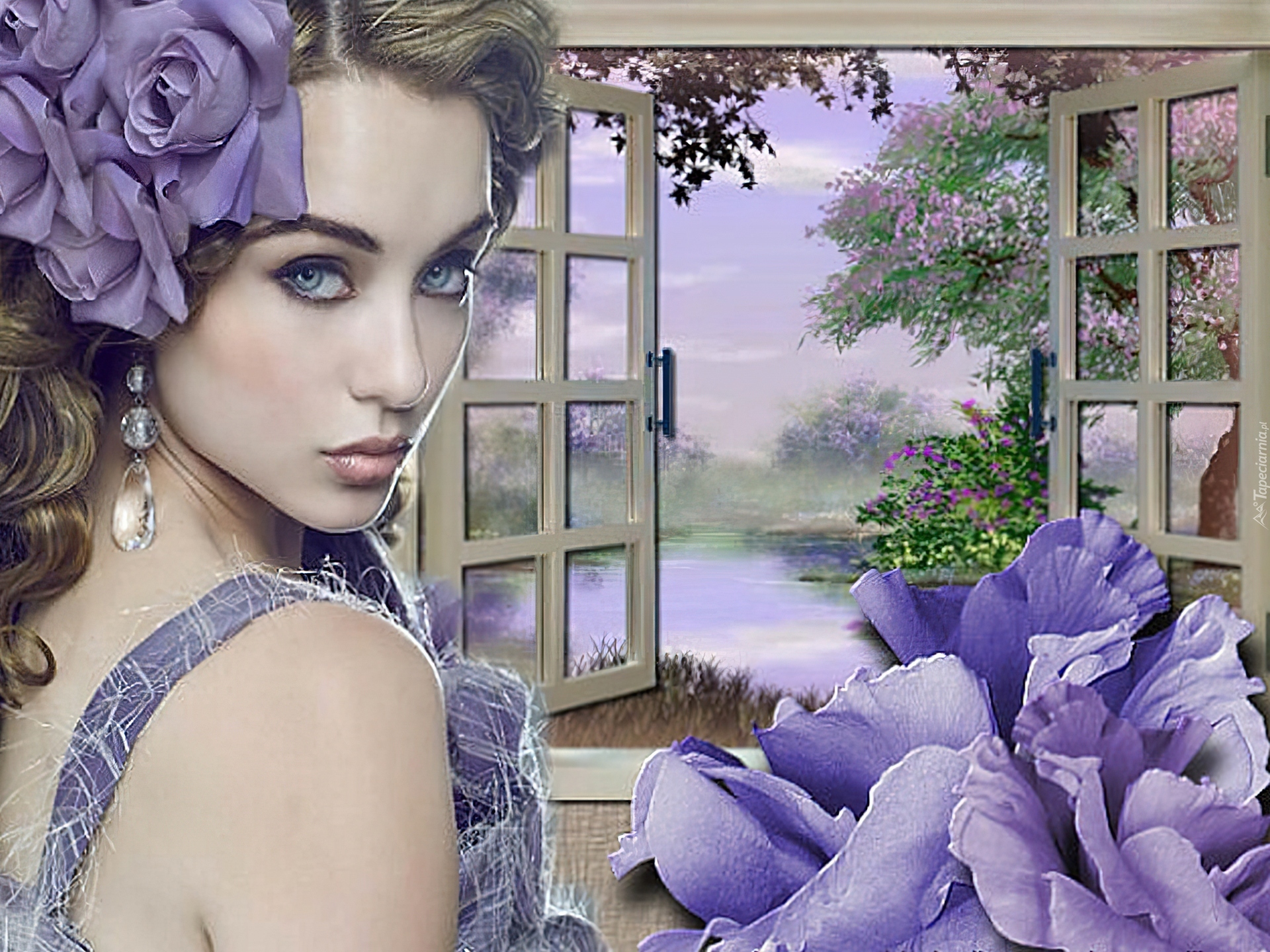 Edytor tapety: Kobieta, Okno, Kwiat, Fiolet