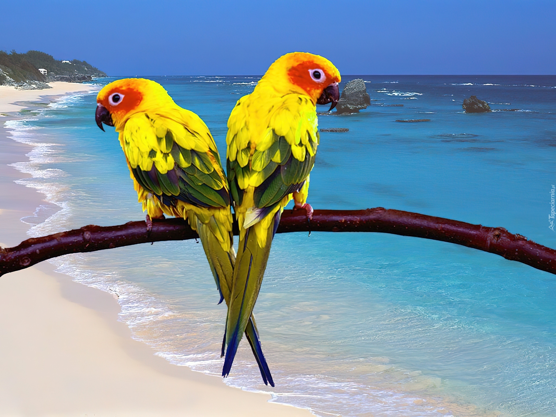 Edytor tapety: Dwie, Papugi, Patyk, Morze