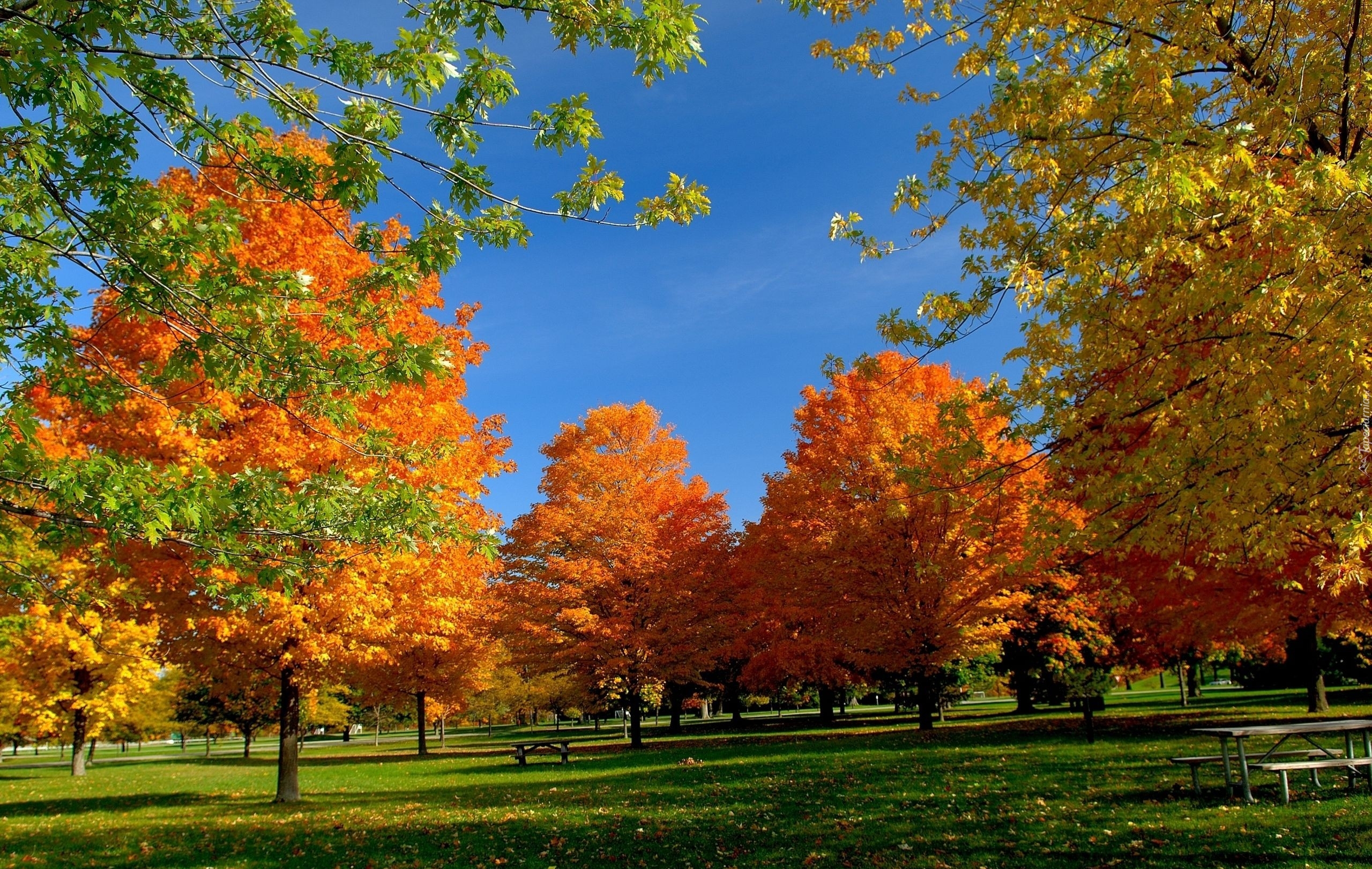 Edytor tapety: Jesień, Park, Drzewa, Ławka