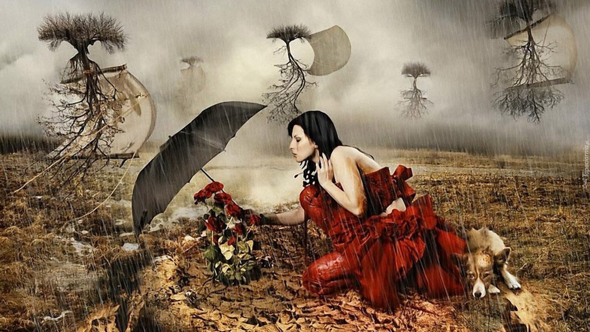 Edytor tapety: Dziewczyna, Kwiaty, Pies, Drzewa, Deszcz
