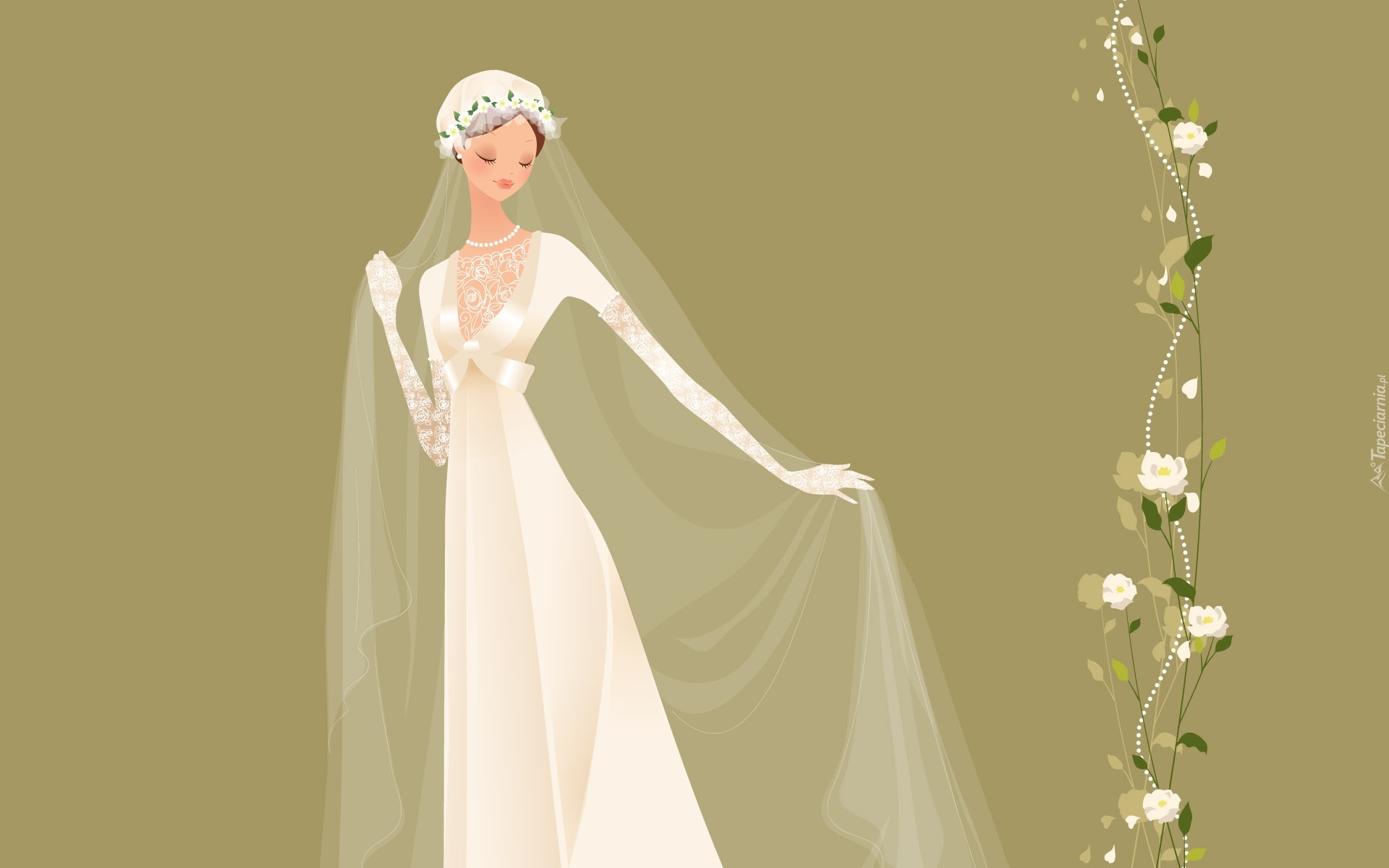 Edytor tapety: Biała, Suknia, Długi, Welon, Kwiaty