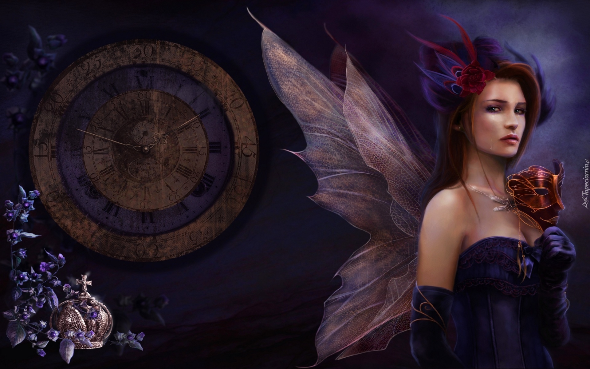 Edytor tapety: Kobieta, Motyl, Maska, Zegar