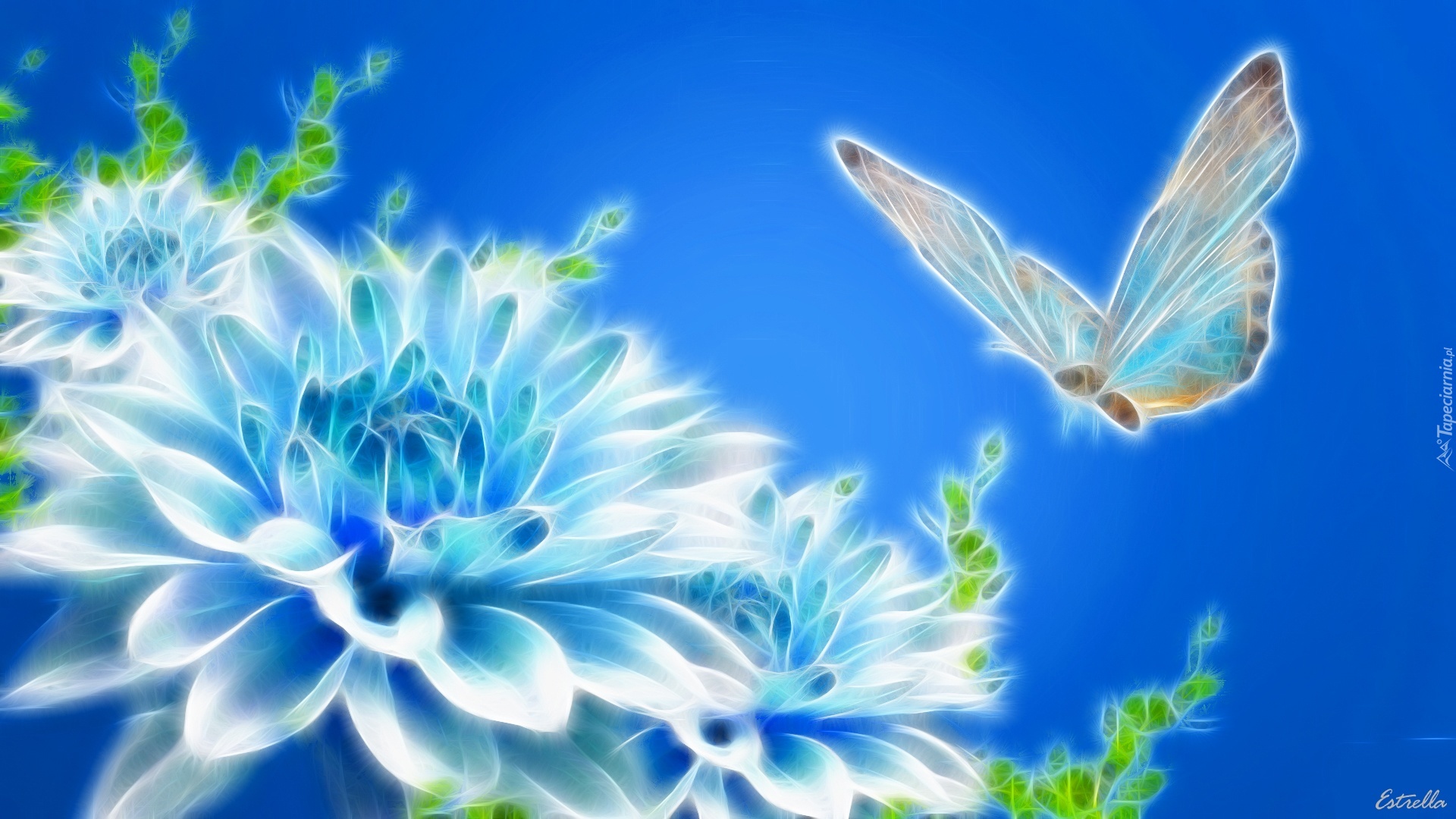Edytor tapety: Niebieskie, Tło, Kwiat, Motyl, 3D