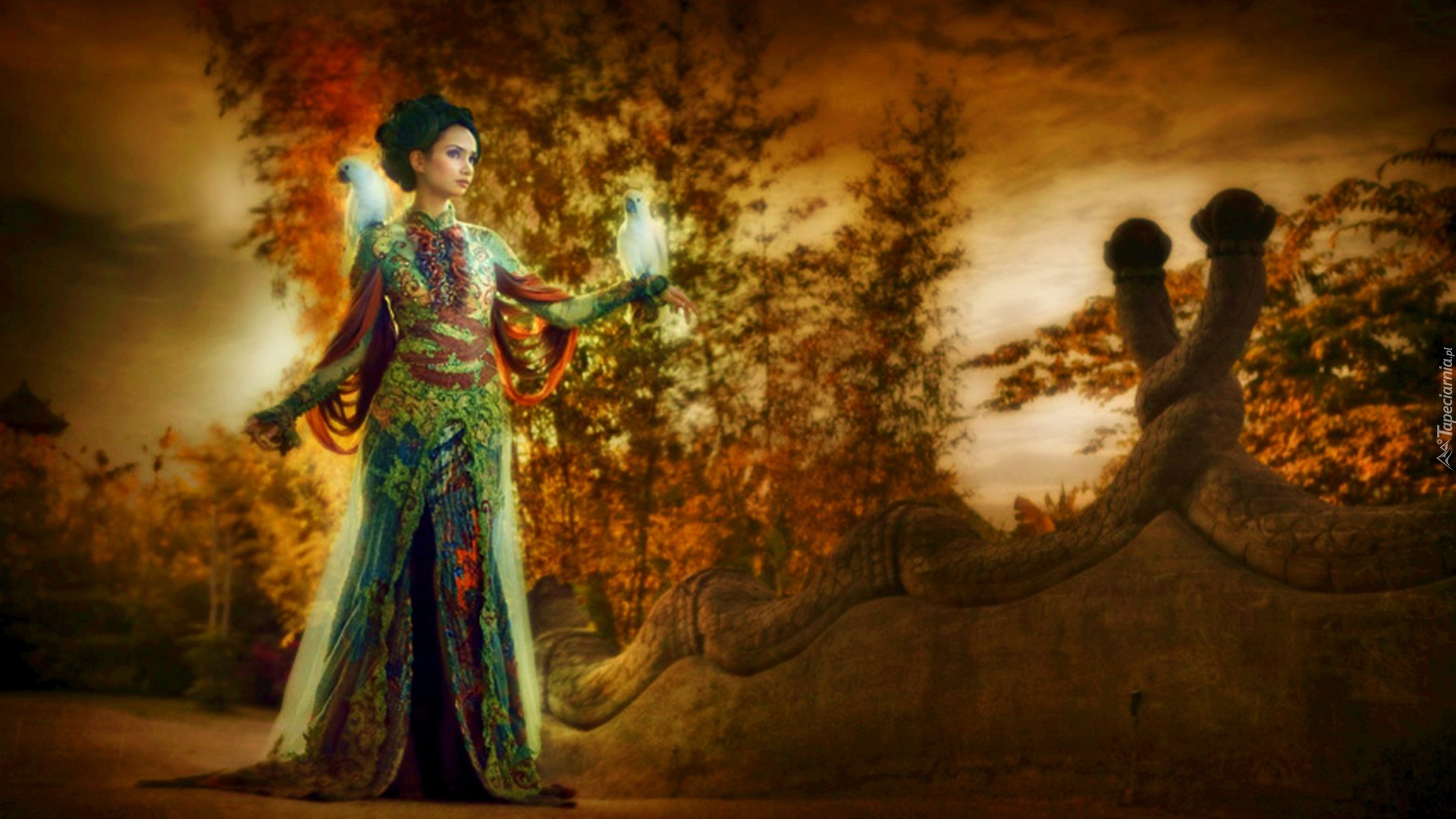 Edytor tapety: Kobieta, Papugi, Zachód, Słońca
