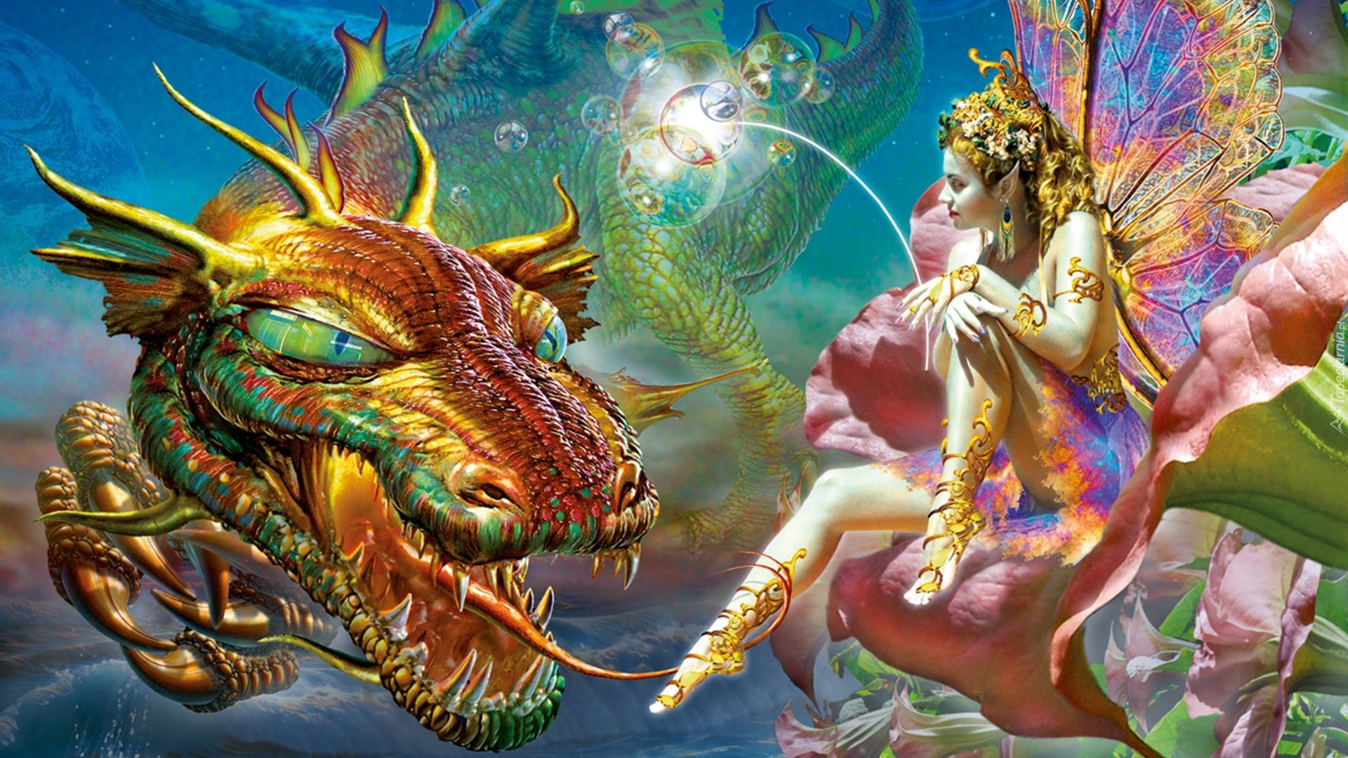 Edytor tapety: Kobieta, Tęczowy, Motyl, Smok