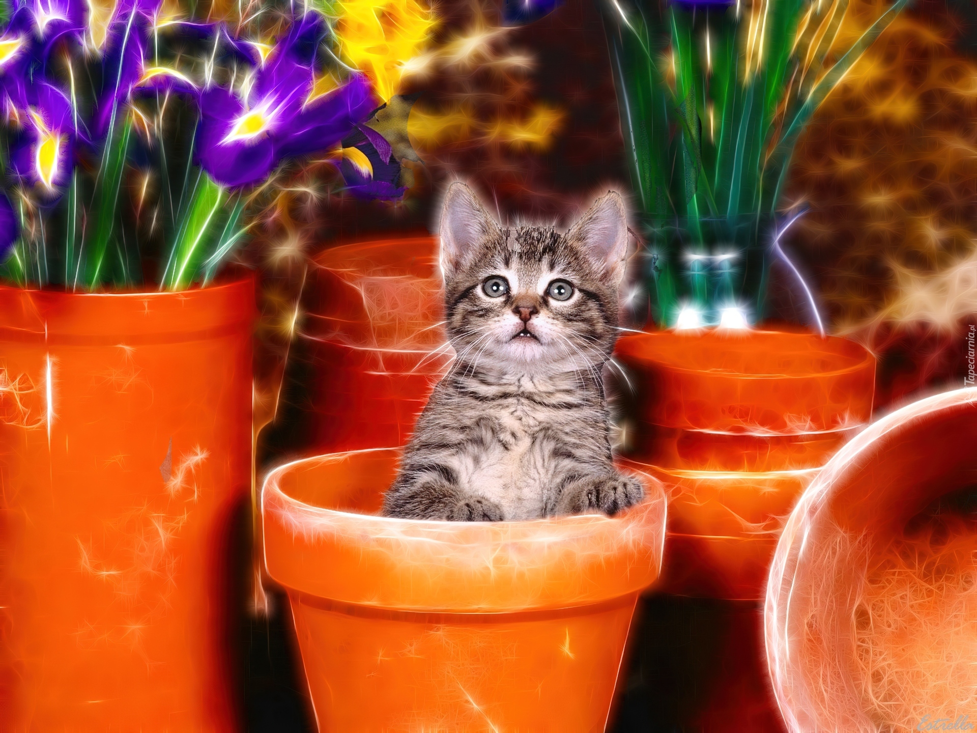 Edytor tapety: Słodki, Mały, Kotek, Doniczki, Kwiaty, Grafika
