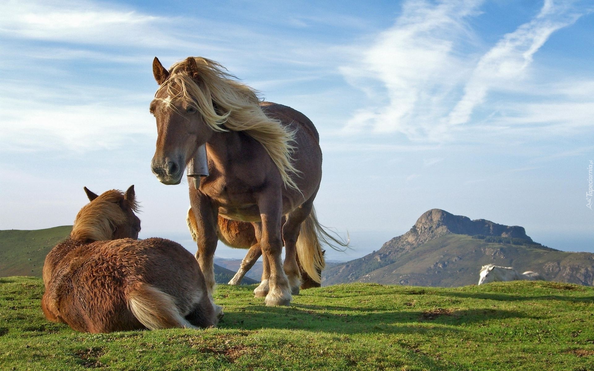 Edytor tapety: Konie, Grzywa, Dzwonek, Łąka, Góry, Wiatr, Niebo