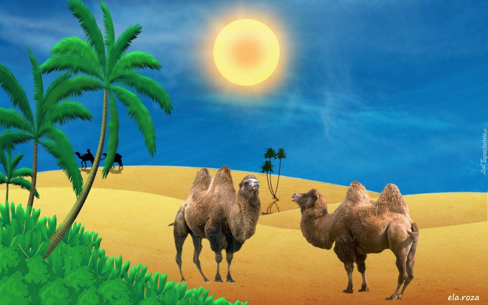 Edytor tapety: Pustynia, Palmy, Wielbłądy