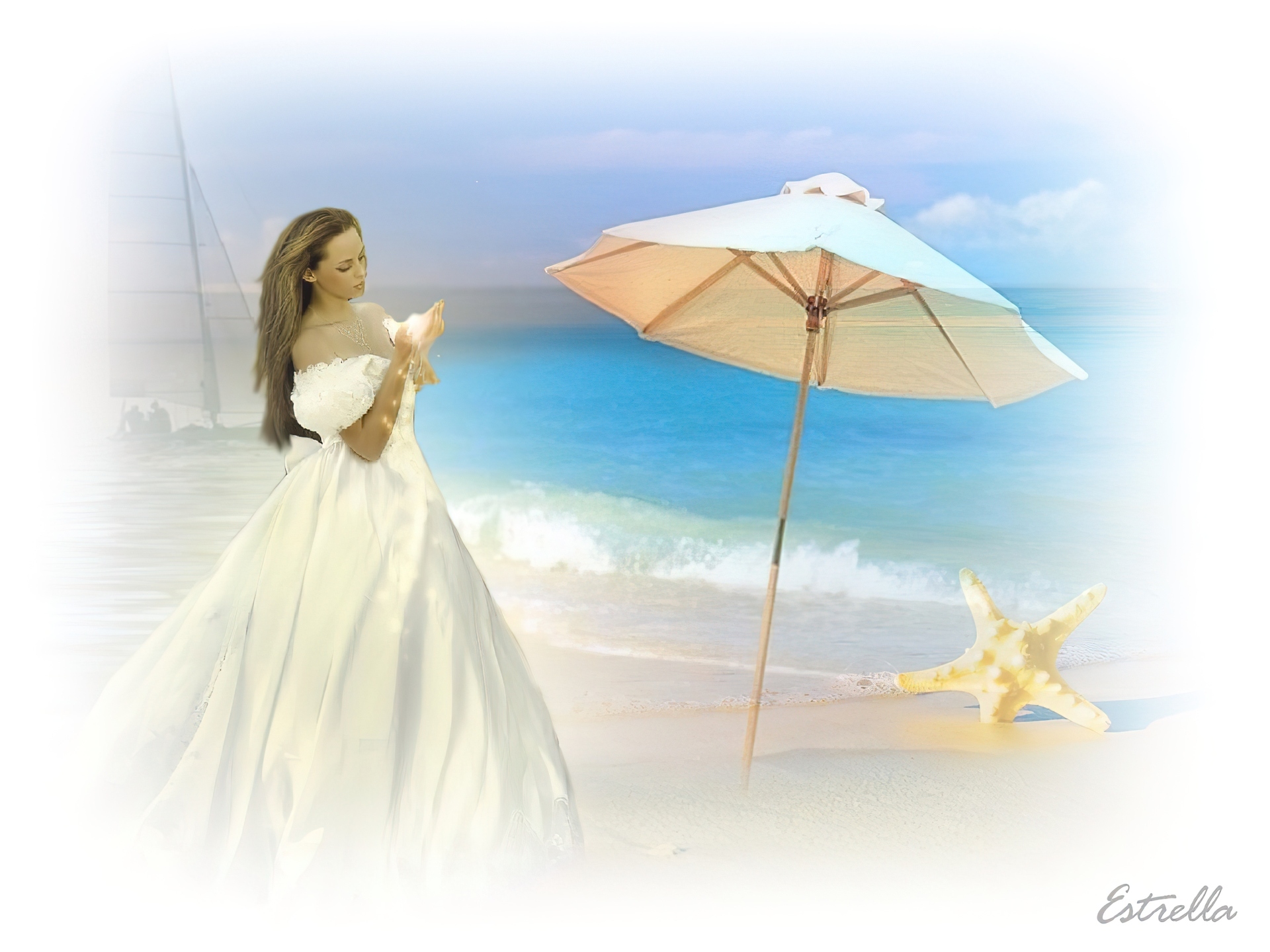 Edytor tapety: Kobieta, Parasol, Rozgwiazda, Morze