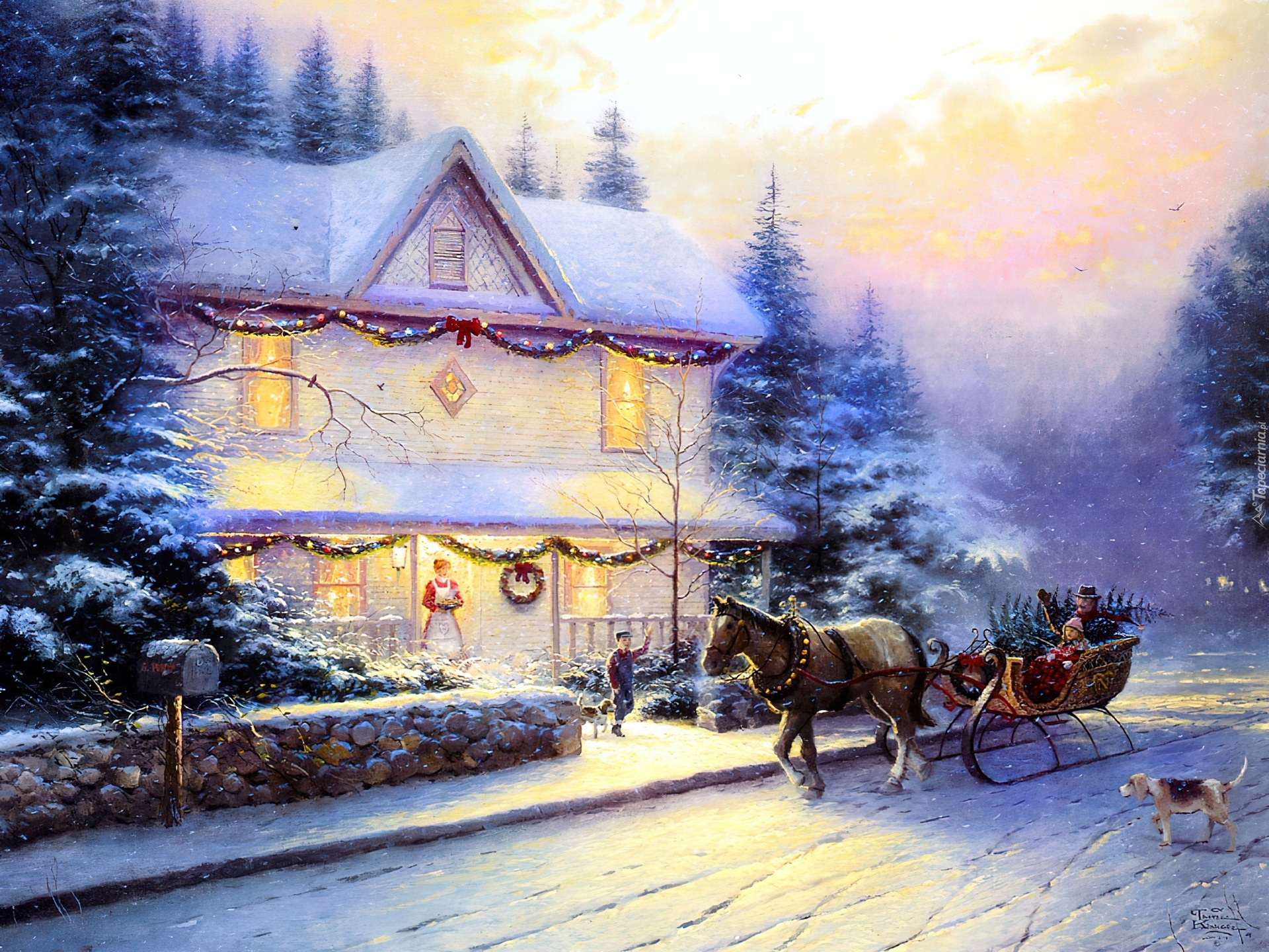 Edytor tapety: Święta, Sanie, Domek, Choinka