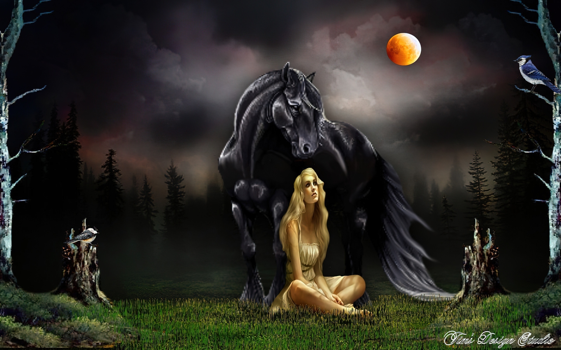 Edytor tapety: Kobieta, Koń, Noc, Góry