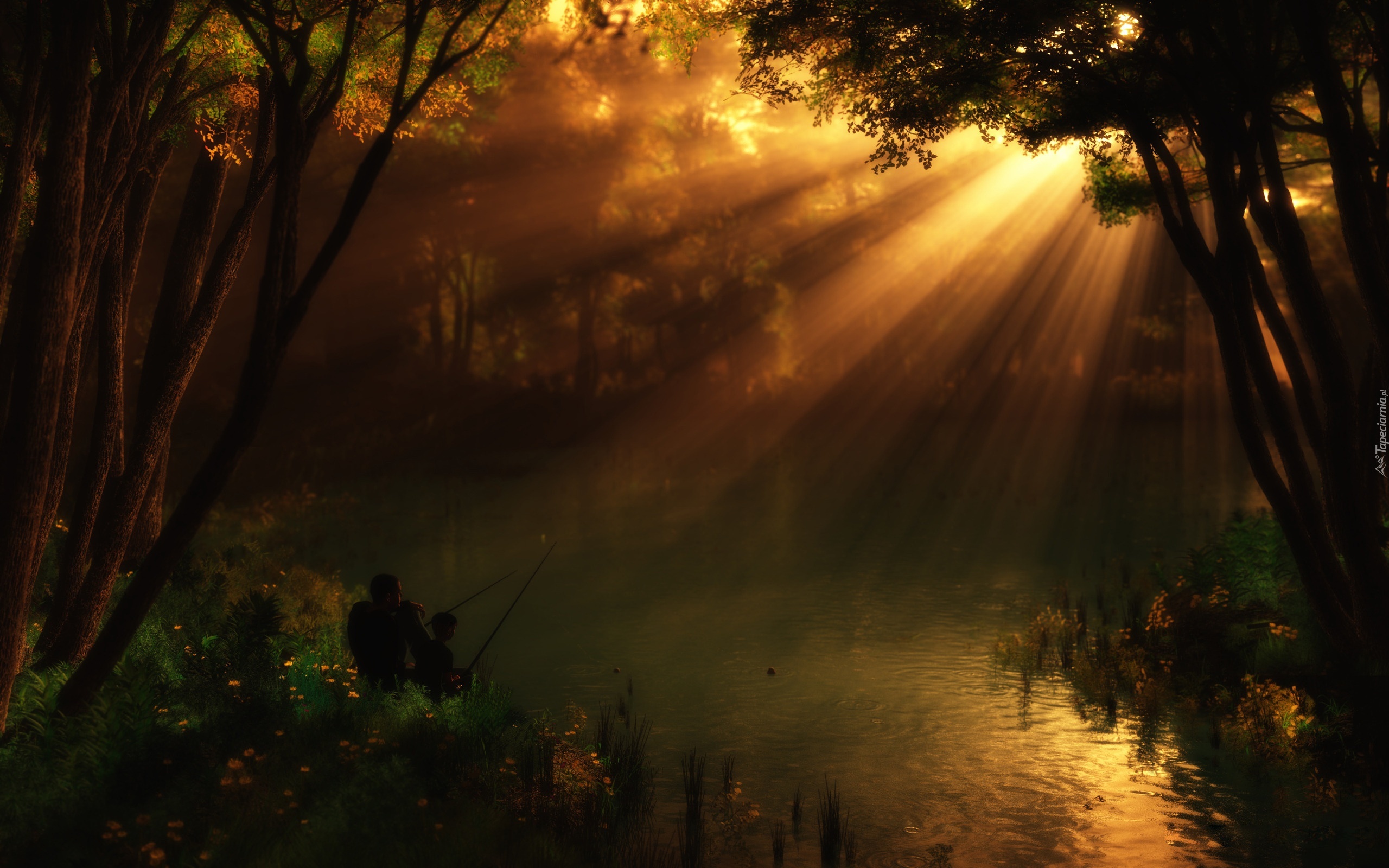 Edytor tapety: Promienie, Słońca, Las Jezioro, Wędkowanie