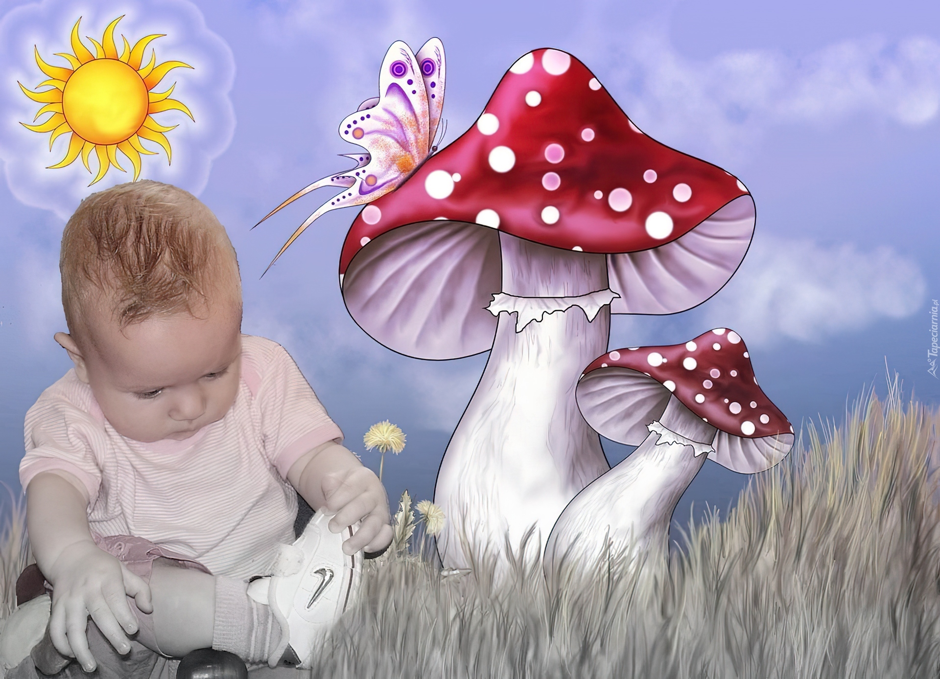 Edytor tapety: Małe, Dziecko, Muchomorki, Motylek
