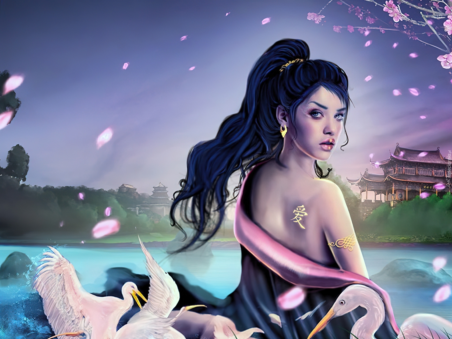 Edytor tapety: Kobieta, Płatki, Kwiatów, Woda, Ptaki