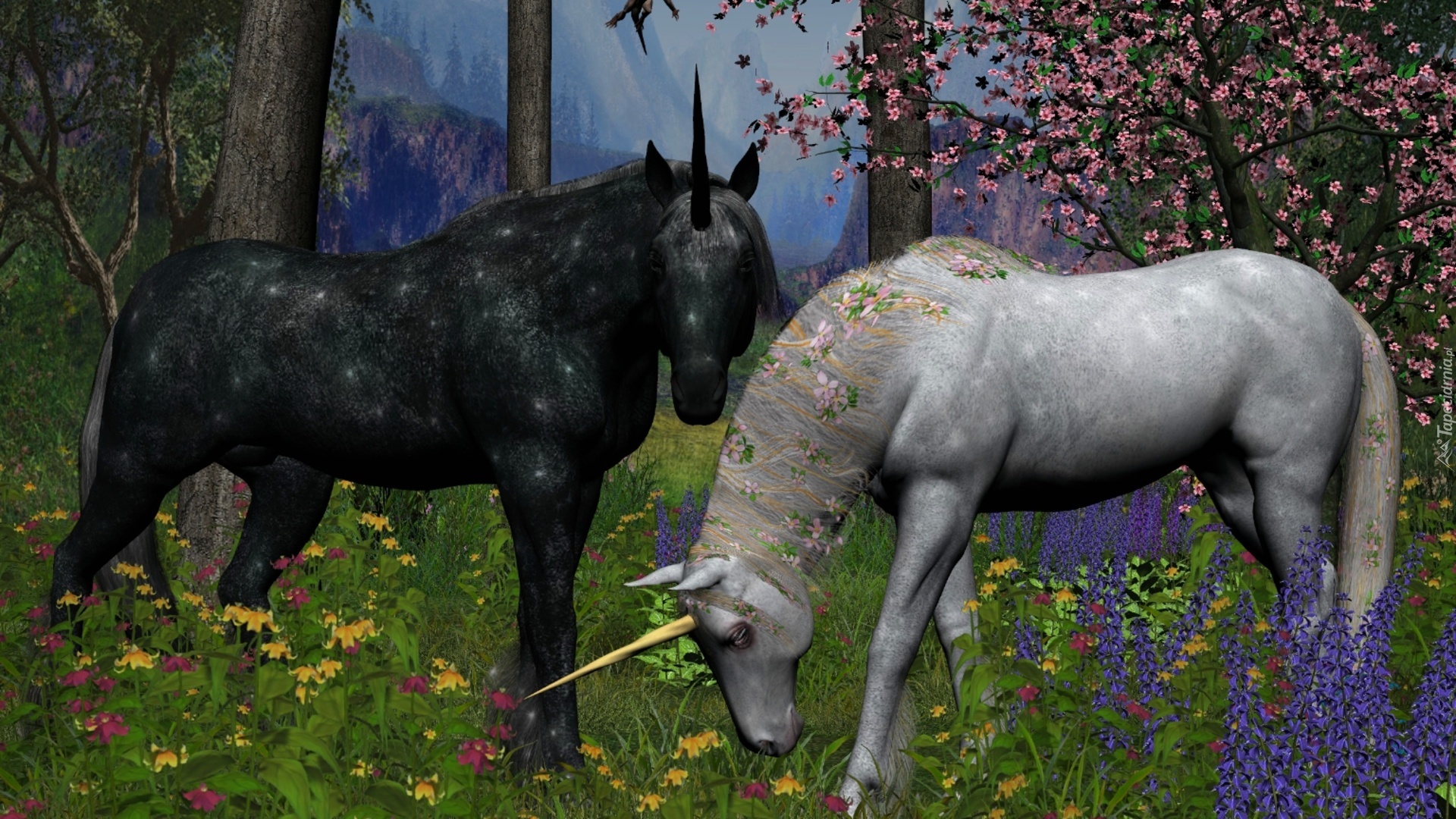 Edytor tapety: Dwa, Jednorożce, Kwiaty, Drzewa