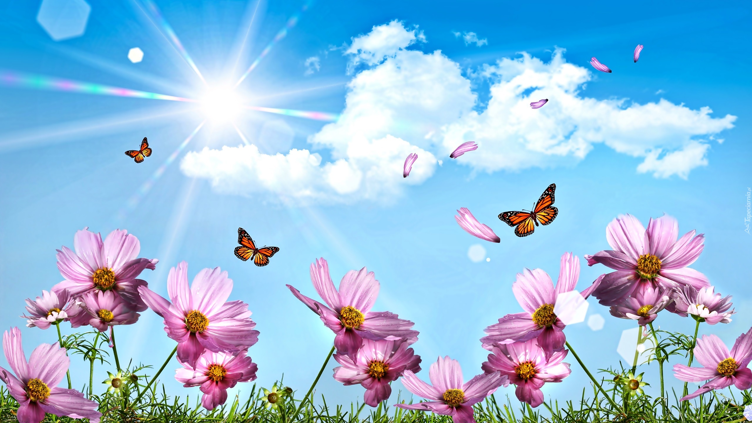 Edytor tapety: Niebo, Motyle, Kwiaty