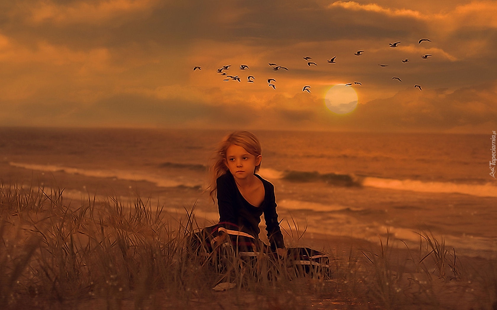Edytor tapety: Dziewczynka, Plaża, Ptaki