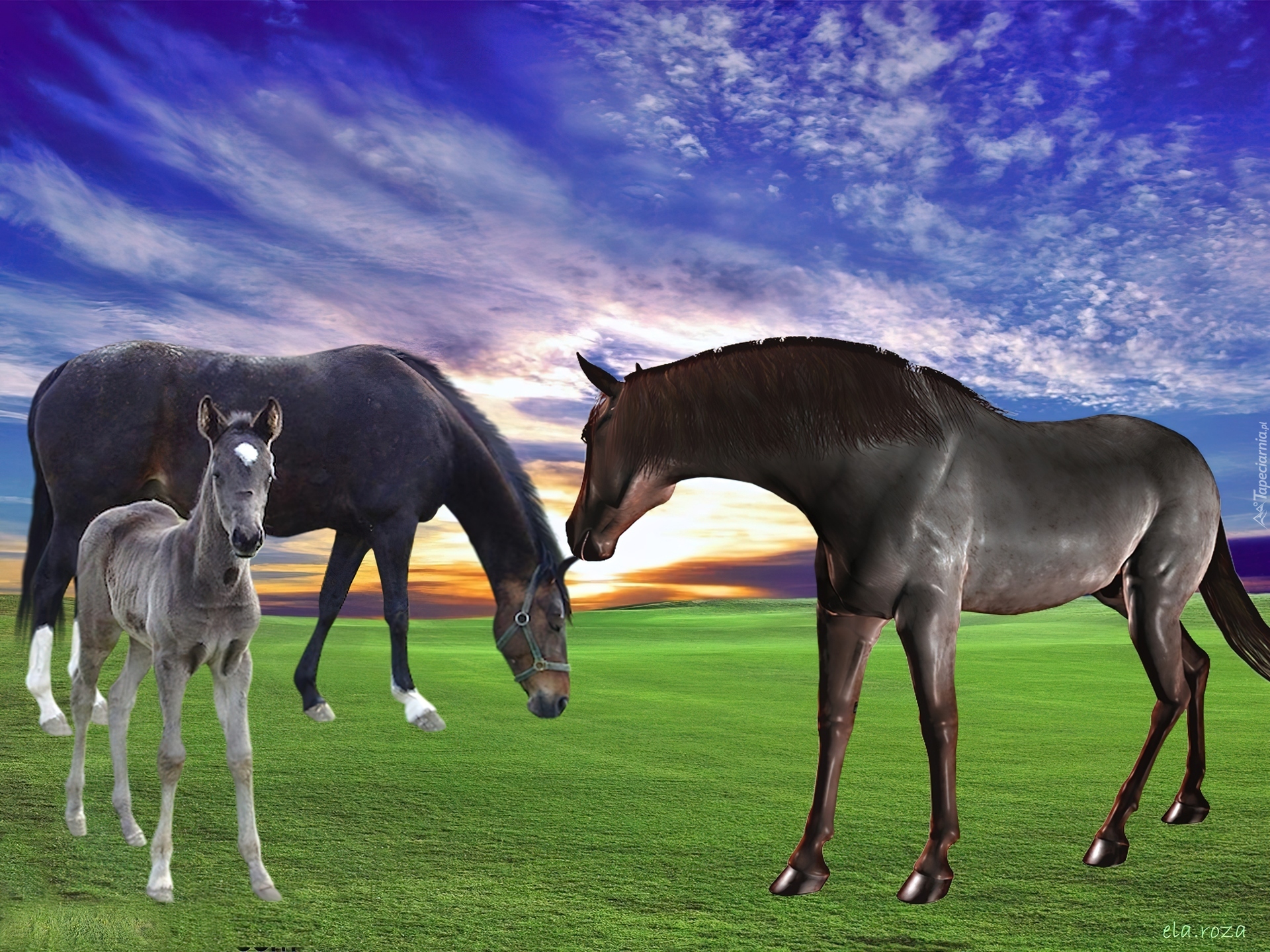 Edytor tapety: Trzy, Konie, Łąka, Wypas
