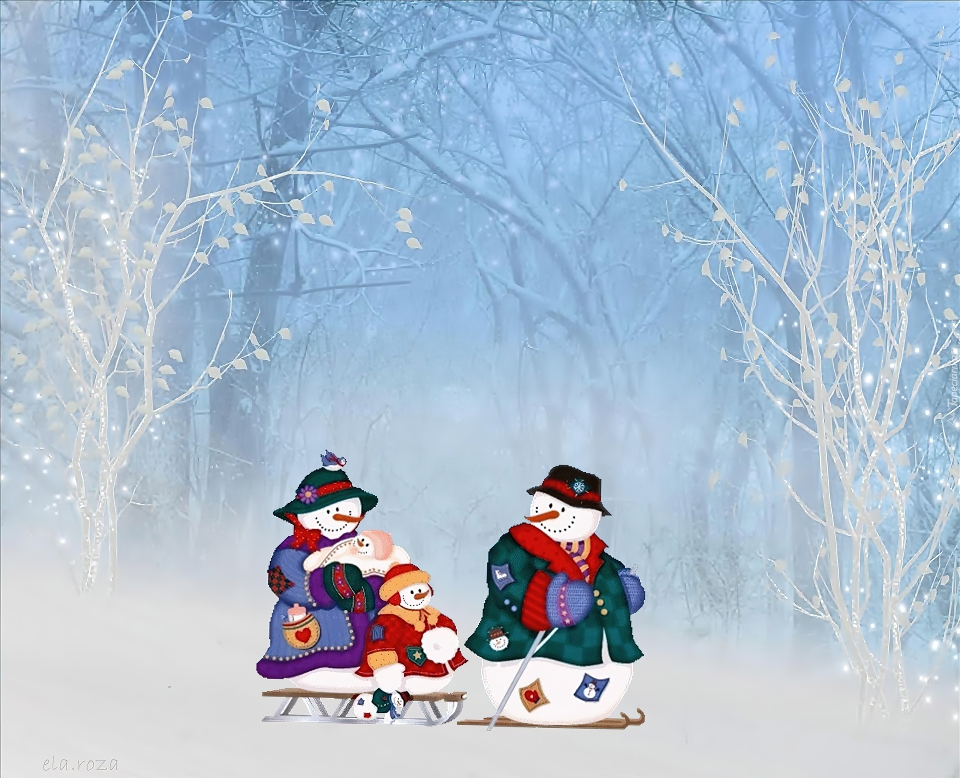 Edytor tapety: Zima, Śnieg, Drzewa, Bałwanki, Rodzina