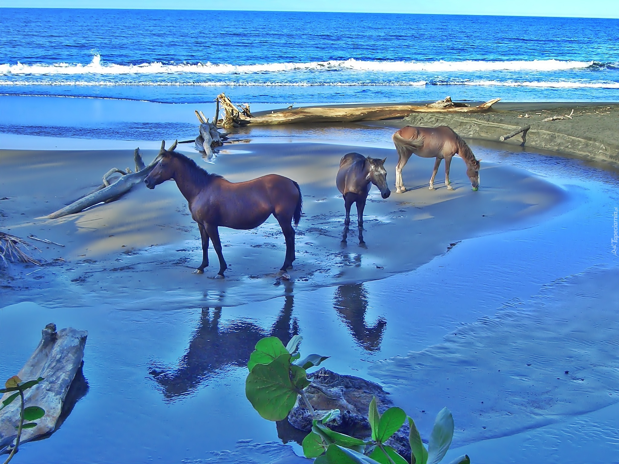 Edytor tapety: Trzy, Konie, Plaża, Morze