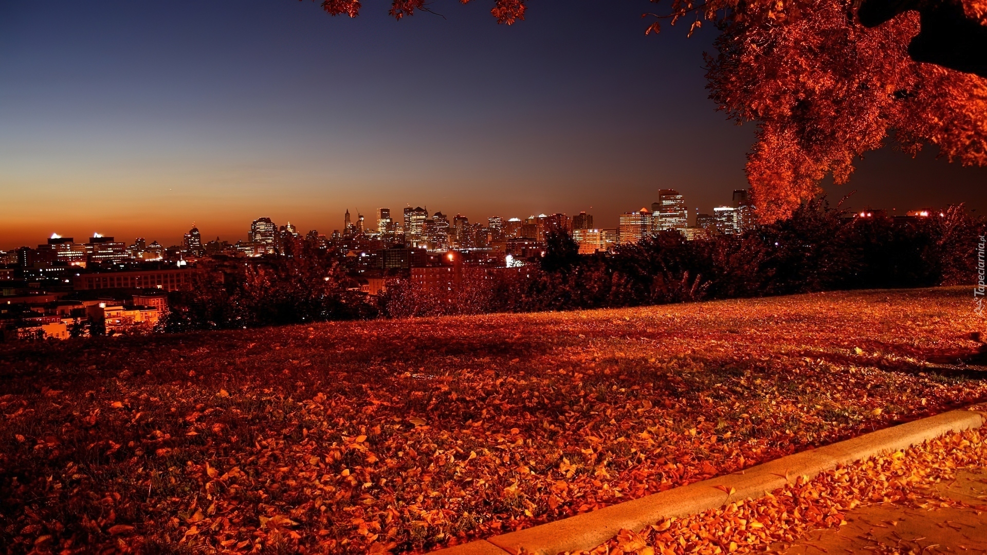 Edytor tapety: Widok, Na, Miasto, Wieczór, Jesień, Liście