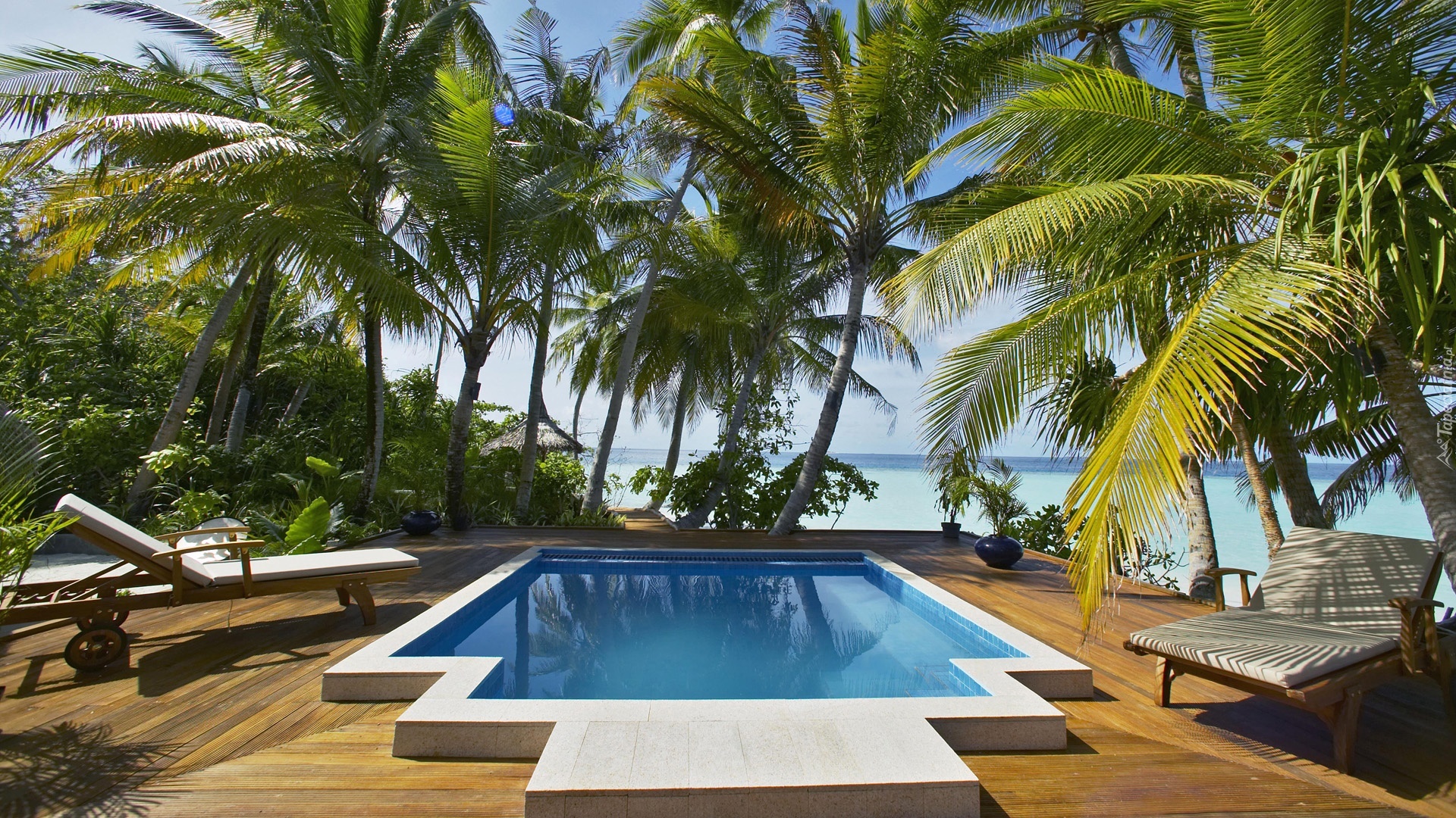 Edytor tapety: Hotel, Palmy, Basen, Leżaki, Wakacje
