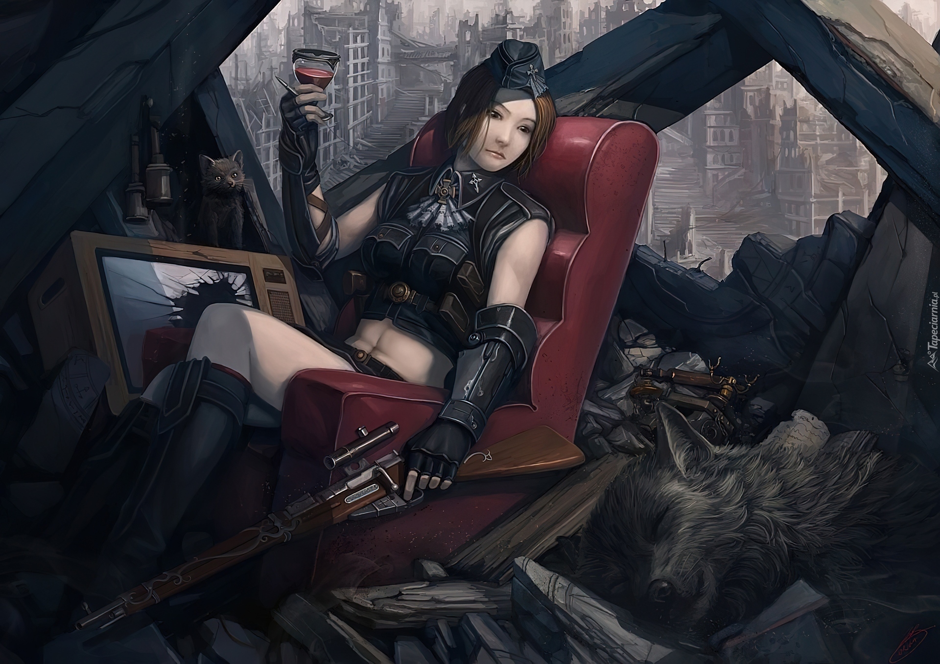 Edytor tapety: Dziewczyna, Broń, Zwierzęta, Ruiny