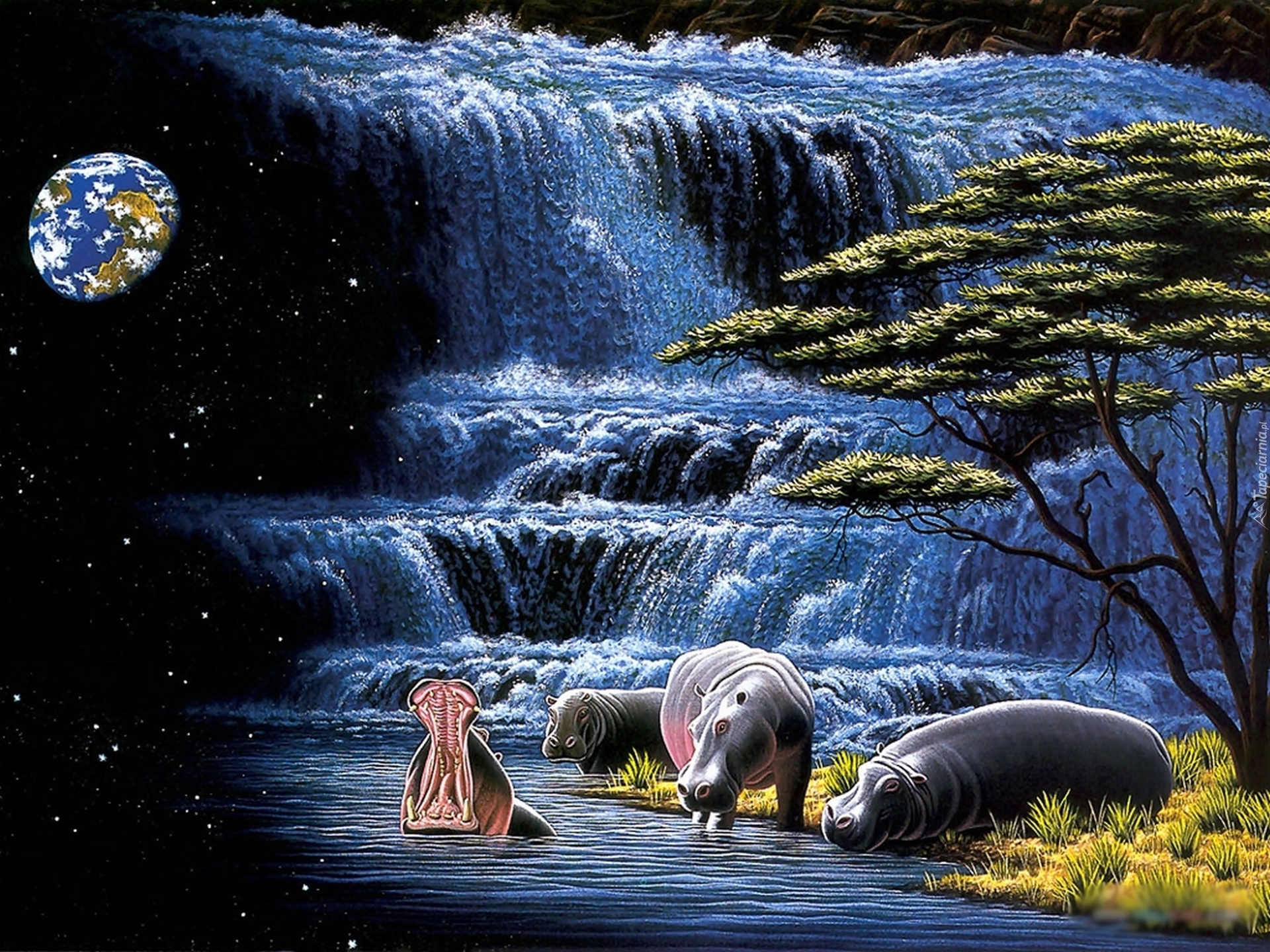 Edytor tapety: Hipopotamy, Wodospad, Planeta
