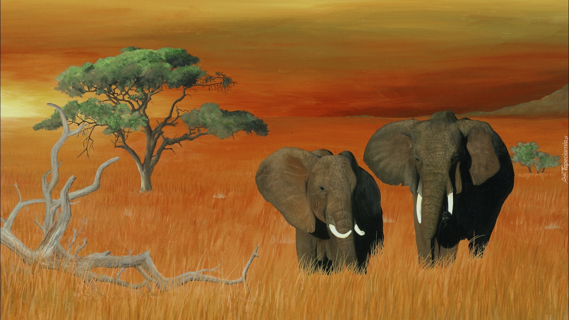 Edytor tapety: Słonie, Zachód, Słońca, Drzewo