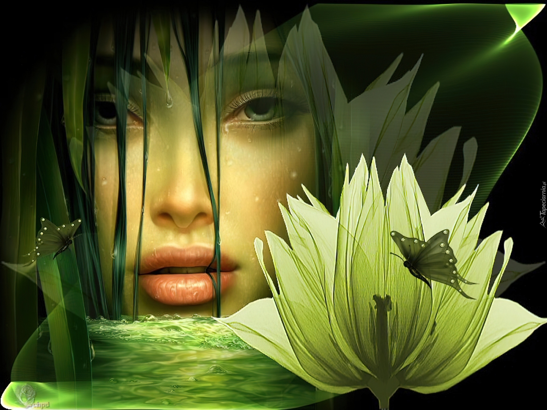 Edytor tapety: Dziewczyna, Woda, Kwiat, Motyl