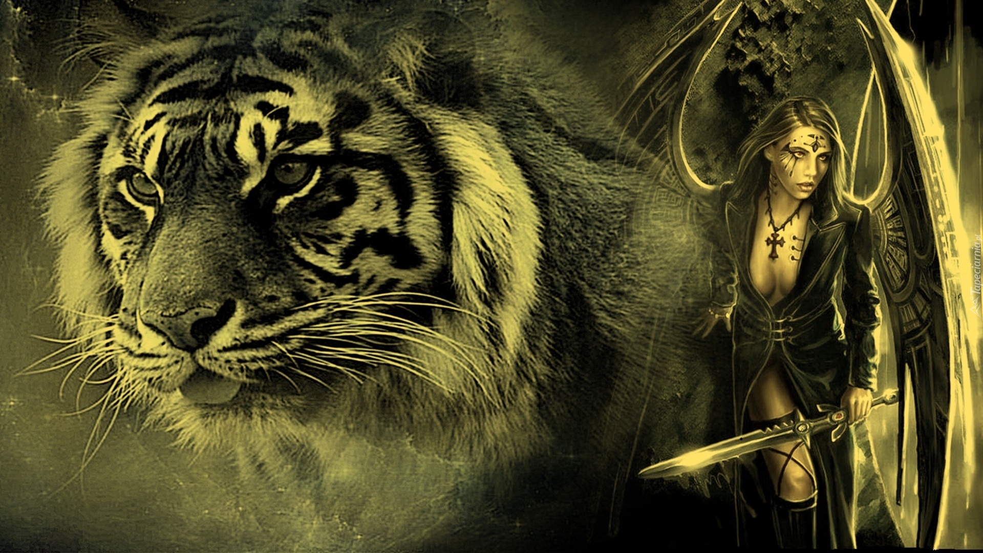 Edytor tapety: Tygrys, Dziewczyna, Miecz