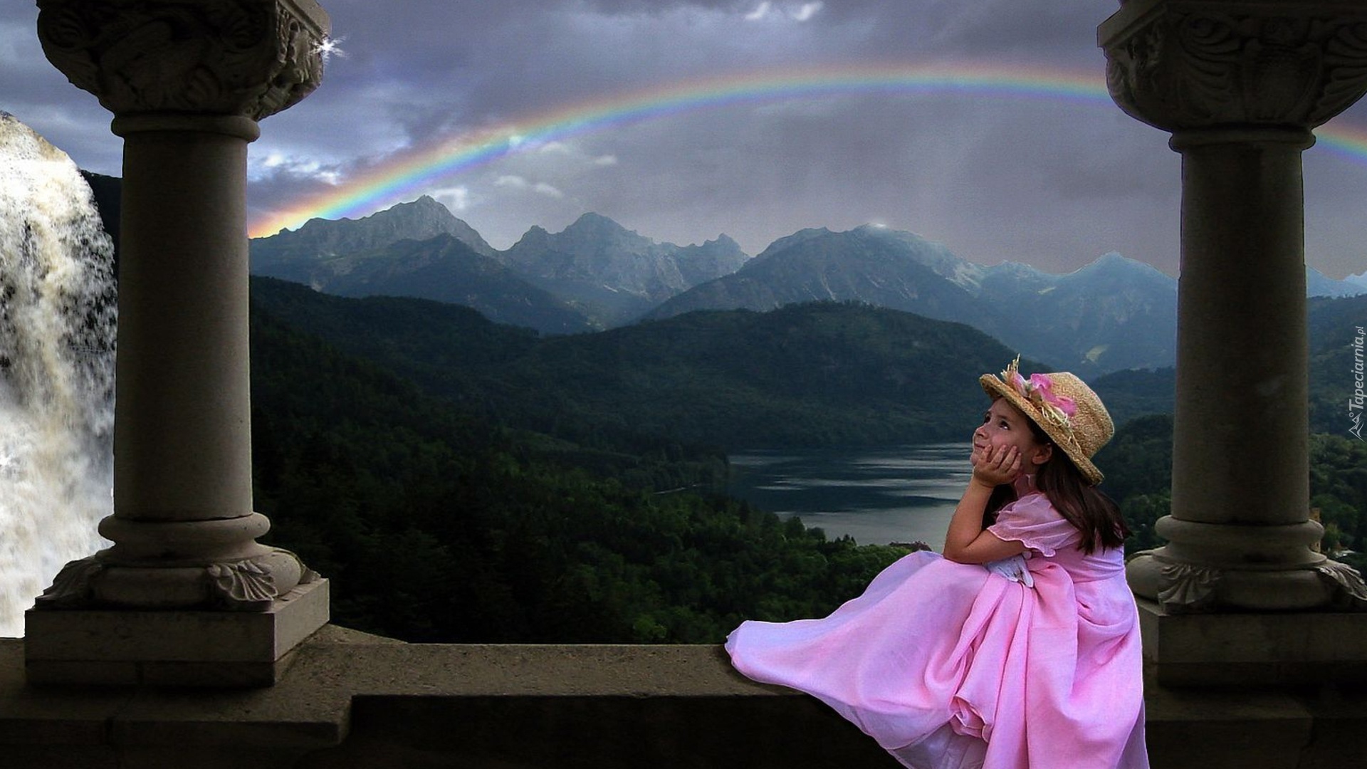 Edytor tapety: Dziewczynka, Góry, Tęcza