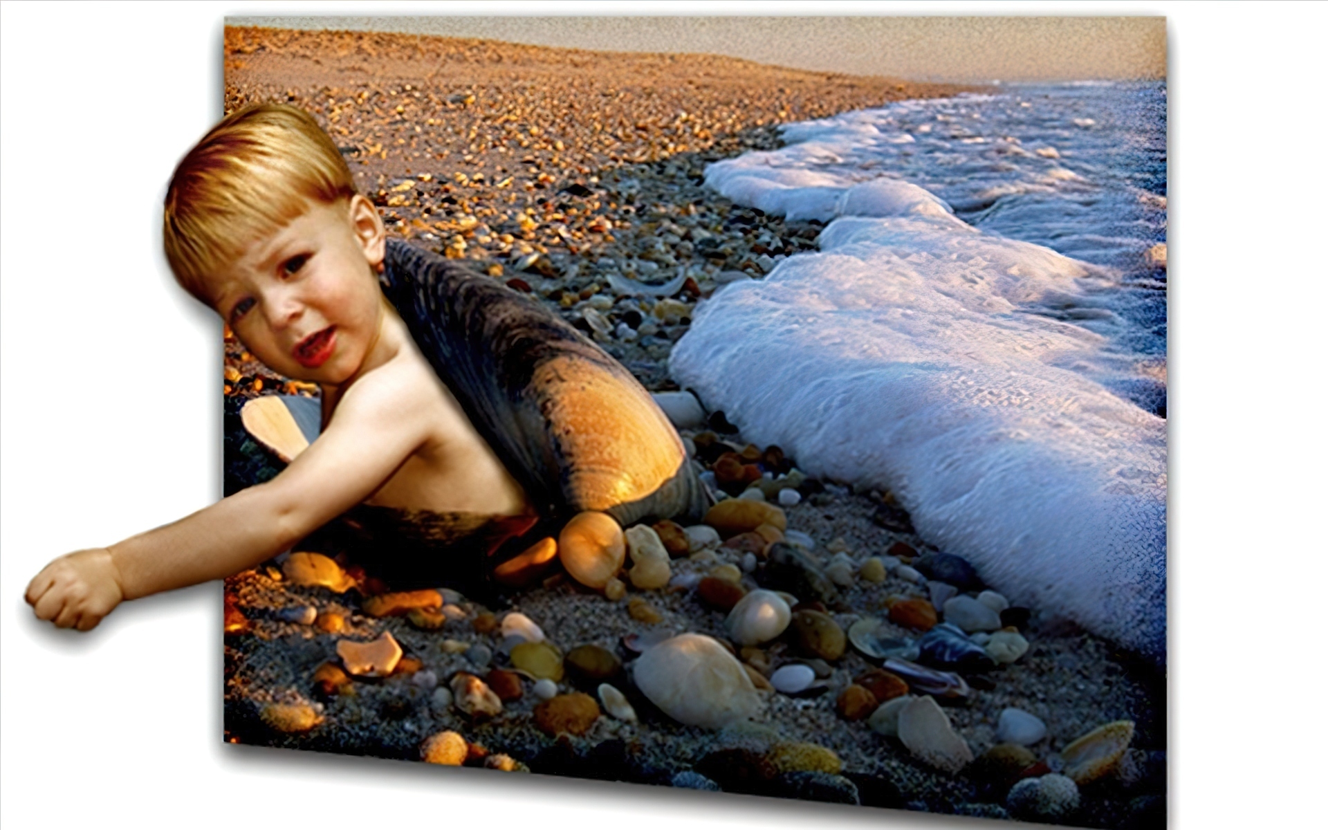 Edytor tapety: Dziecko, Plaża, Kamyki, Fala, 4D