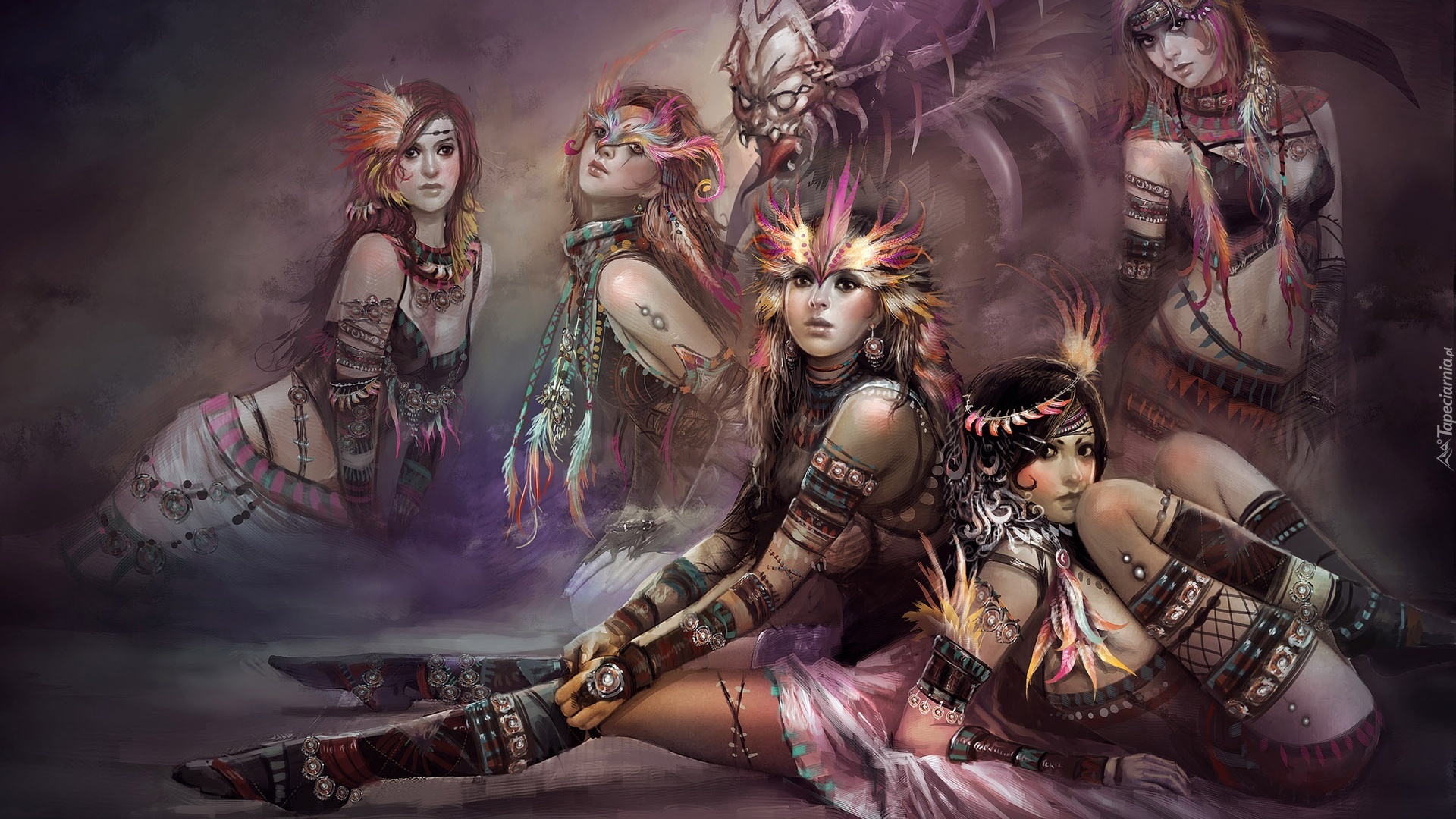 Edytor tapety: Dziewczyny, Maski, Pióra