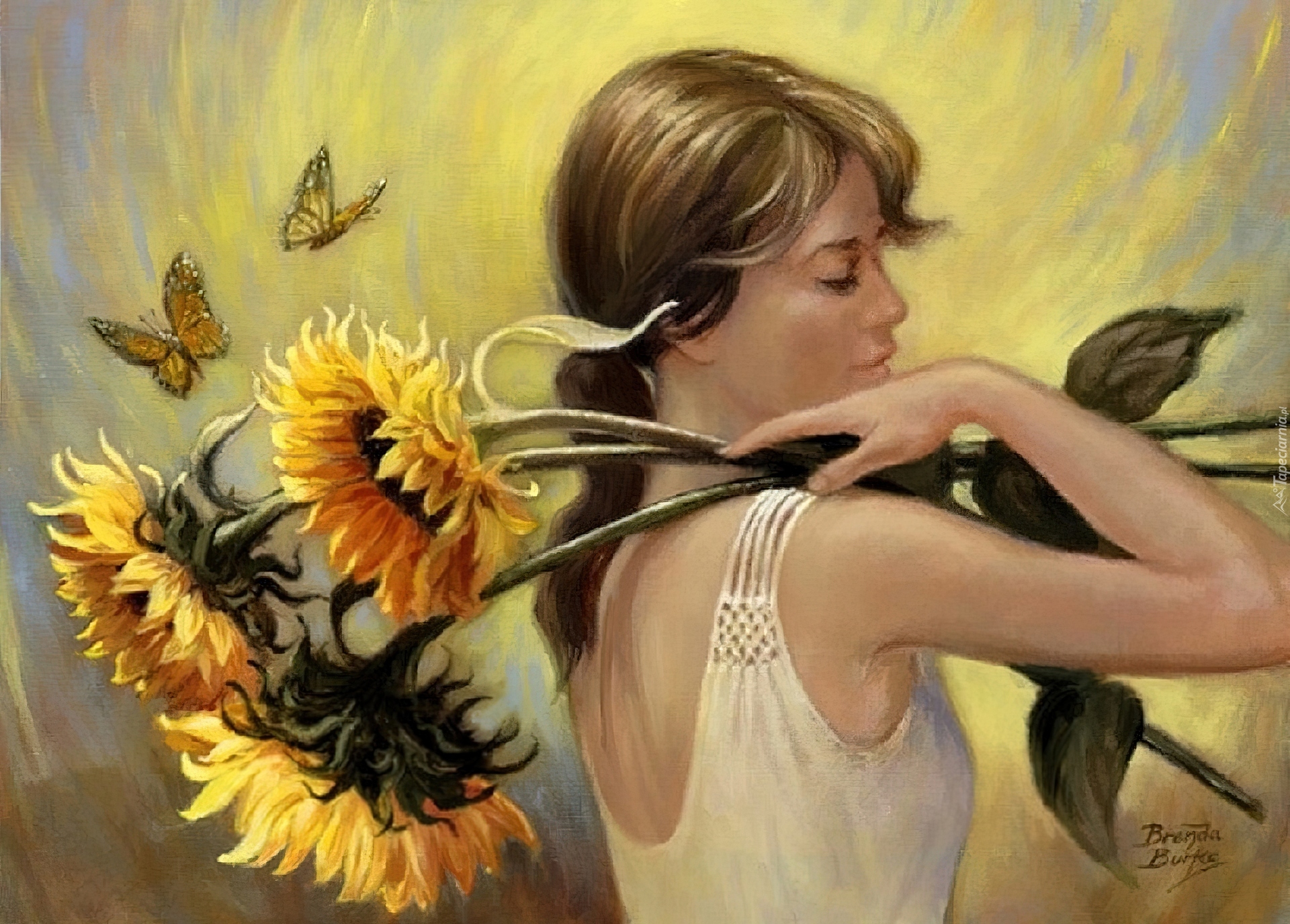 Edytor tapety: Kobieta, Słoneczniki, Motyle