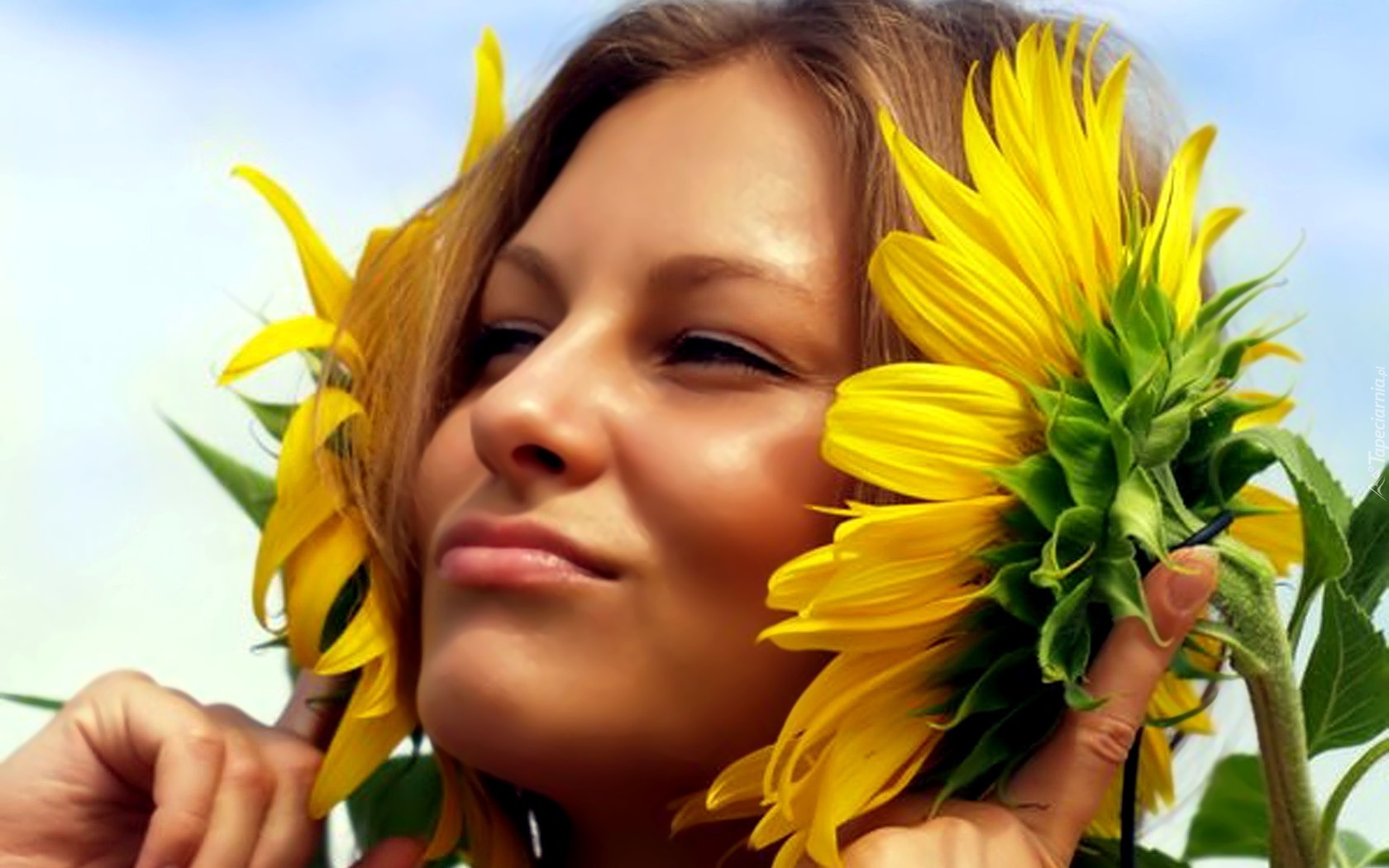 Edytor tapety: Kobieca, Twarz, Słoneczniki