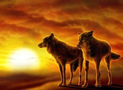 Edytor tapety: Dwa, Wilki, Zachód, Słońca