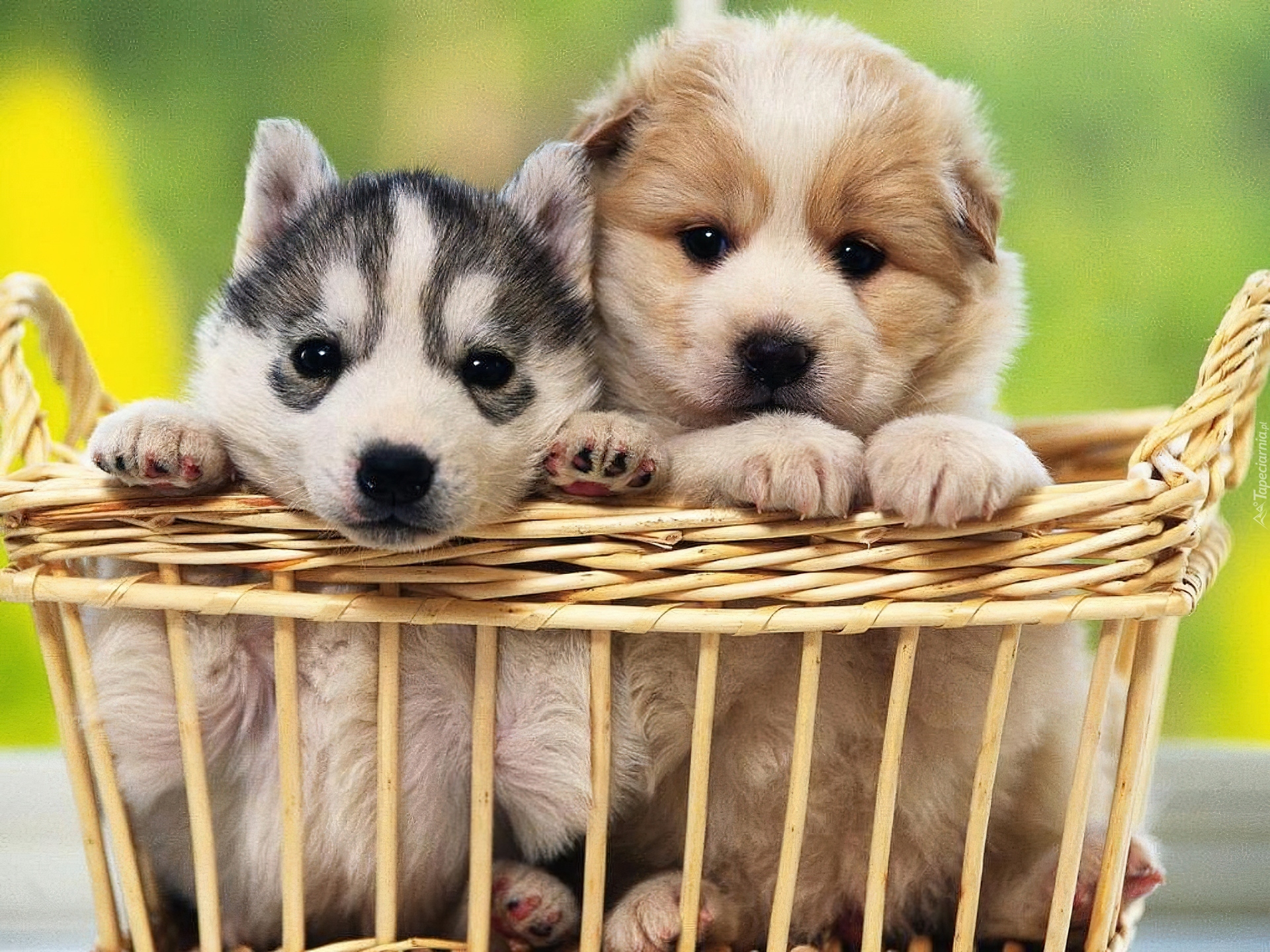 Edytor tapety: Dwa, Szczeniaczki, Koszyk, Siberian Husky