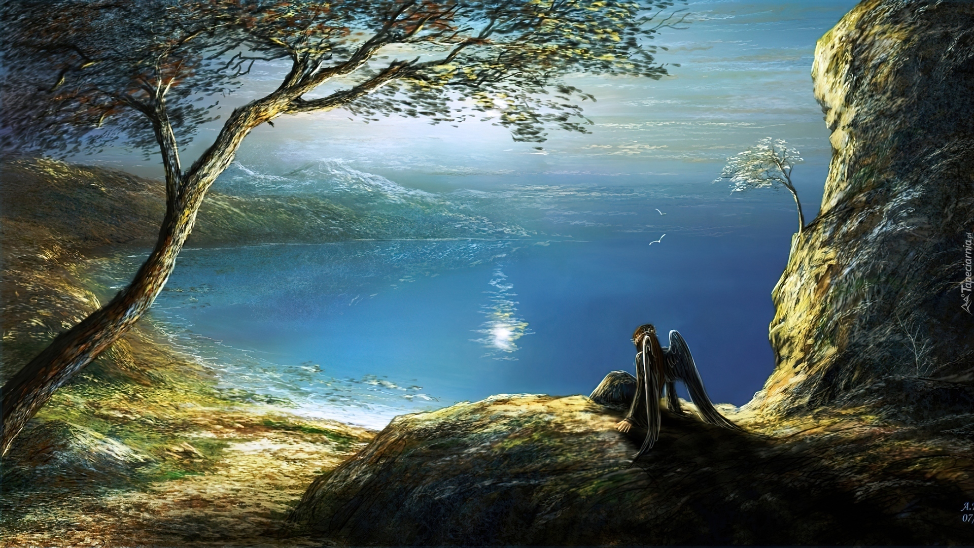 Edytor tapety: Woda, Skały, Anioł
