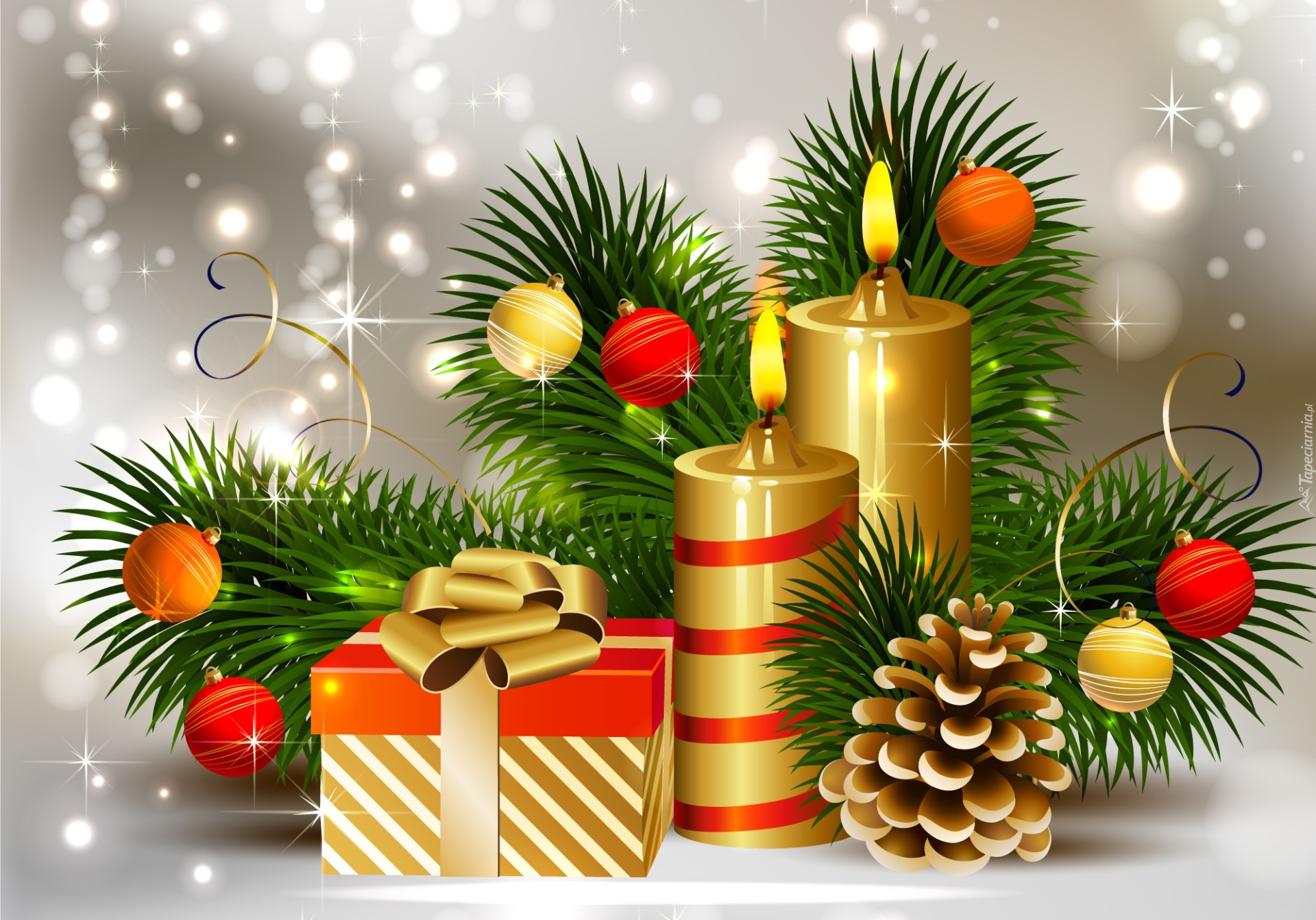Edytor tapety: Prezent, Świeczki, Bombki, Grafika 2D, Dekoracja, Świąteczna