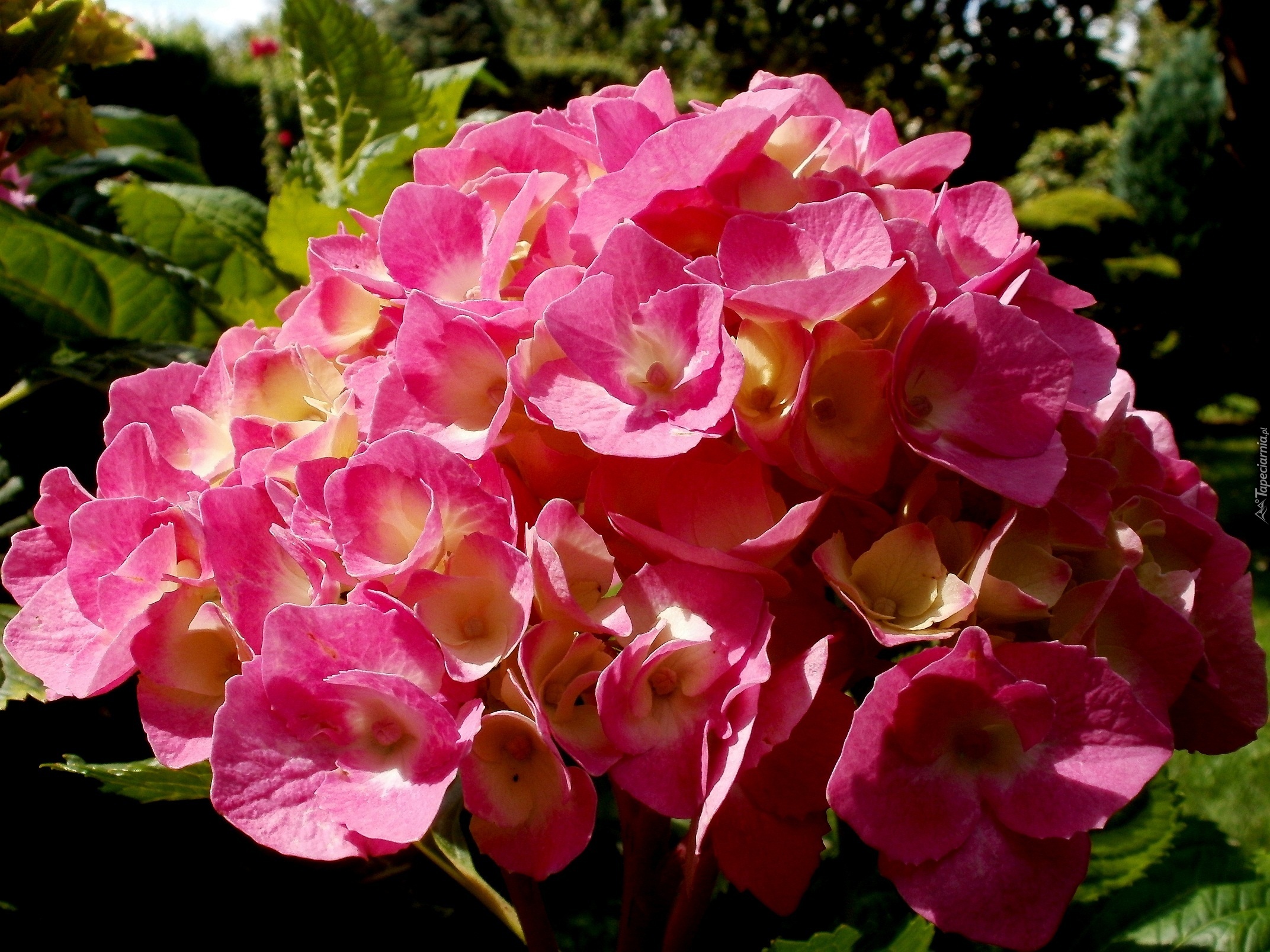 Edytor tapety: Kwiat, Hortensja, Różowa, Liście, Ogród