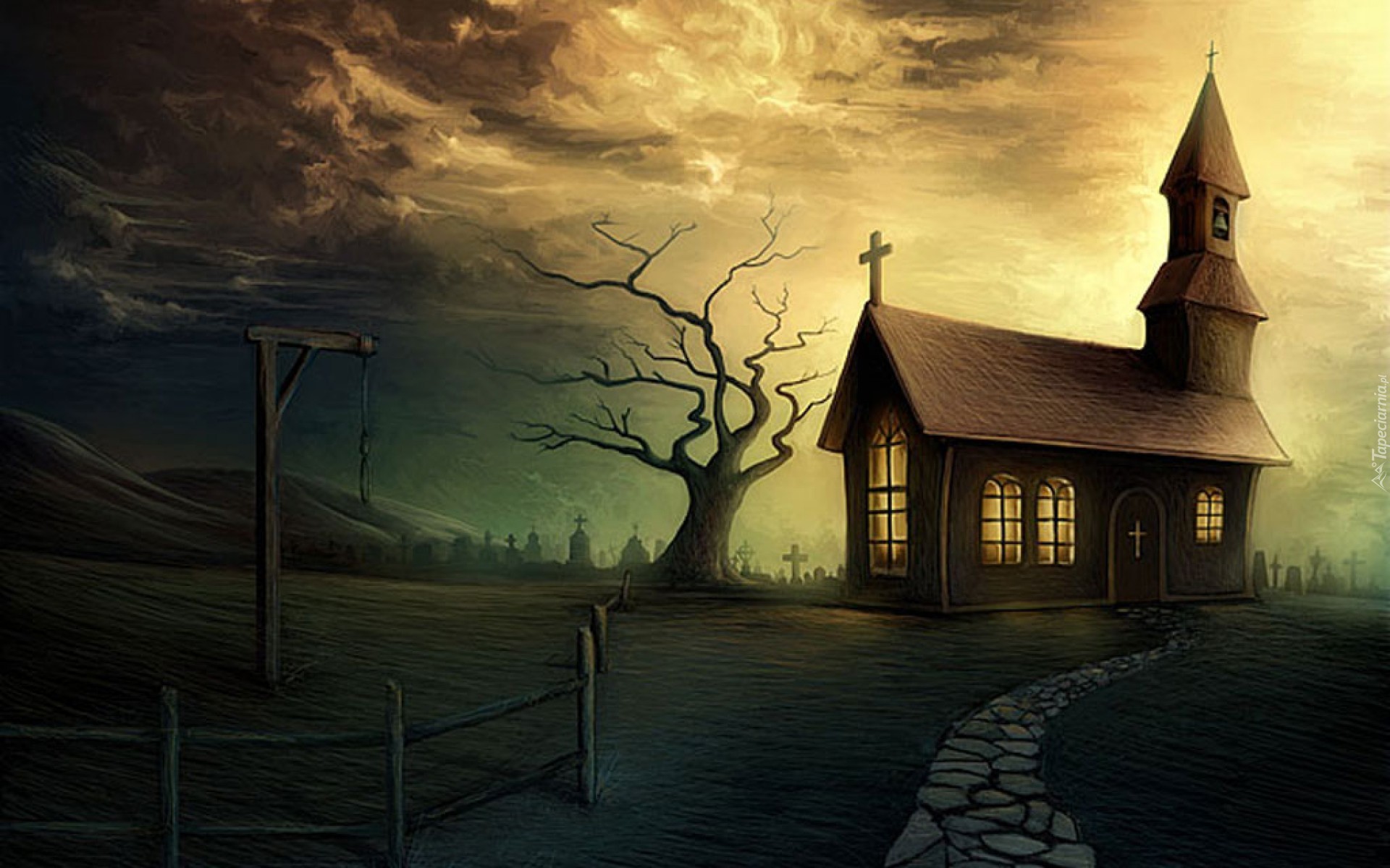 Edytor tapety: Kościół, Noc, Drzewo