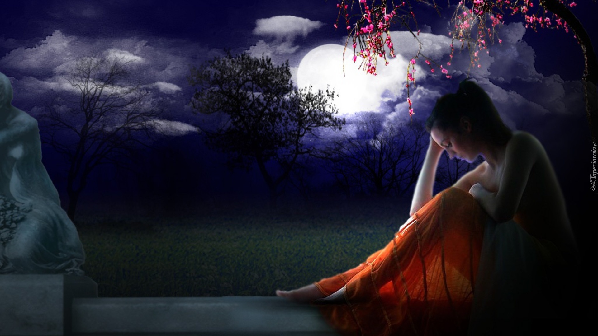 Edytor tapety: Zamyślona, Kobieta, Księżyc