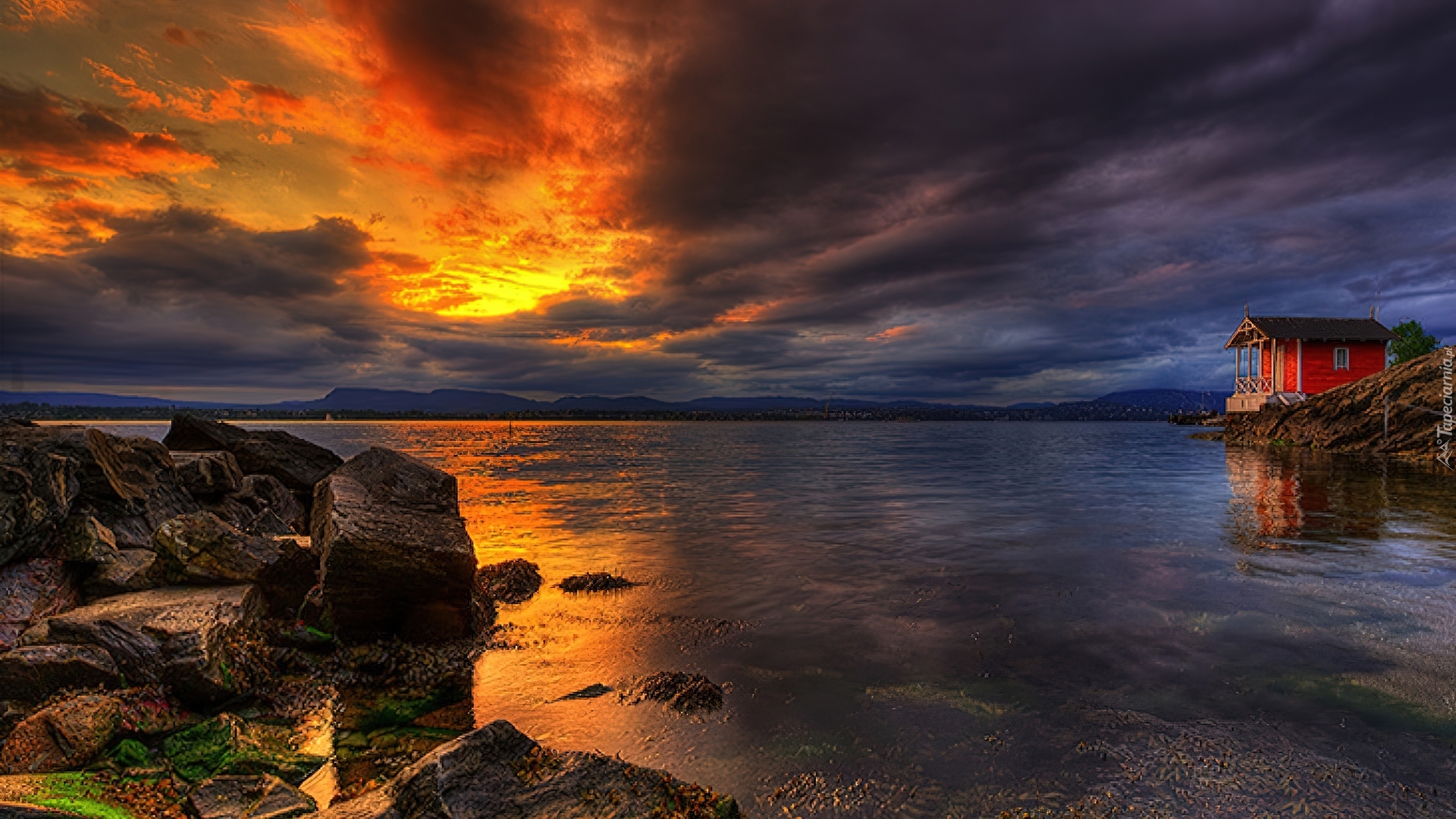 Edytor tapety: Zachód, Słońca, Brzeg, Chatka