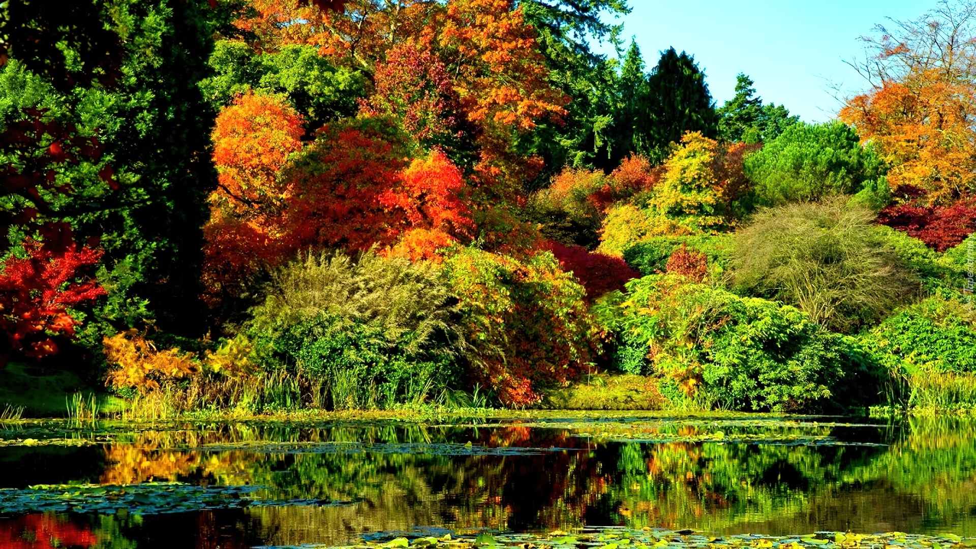 Edytor tapety: Jesień, Staw, Odbicie, Drzew