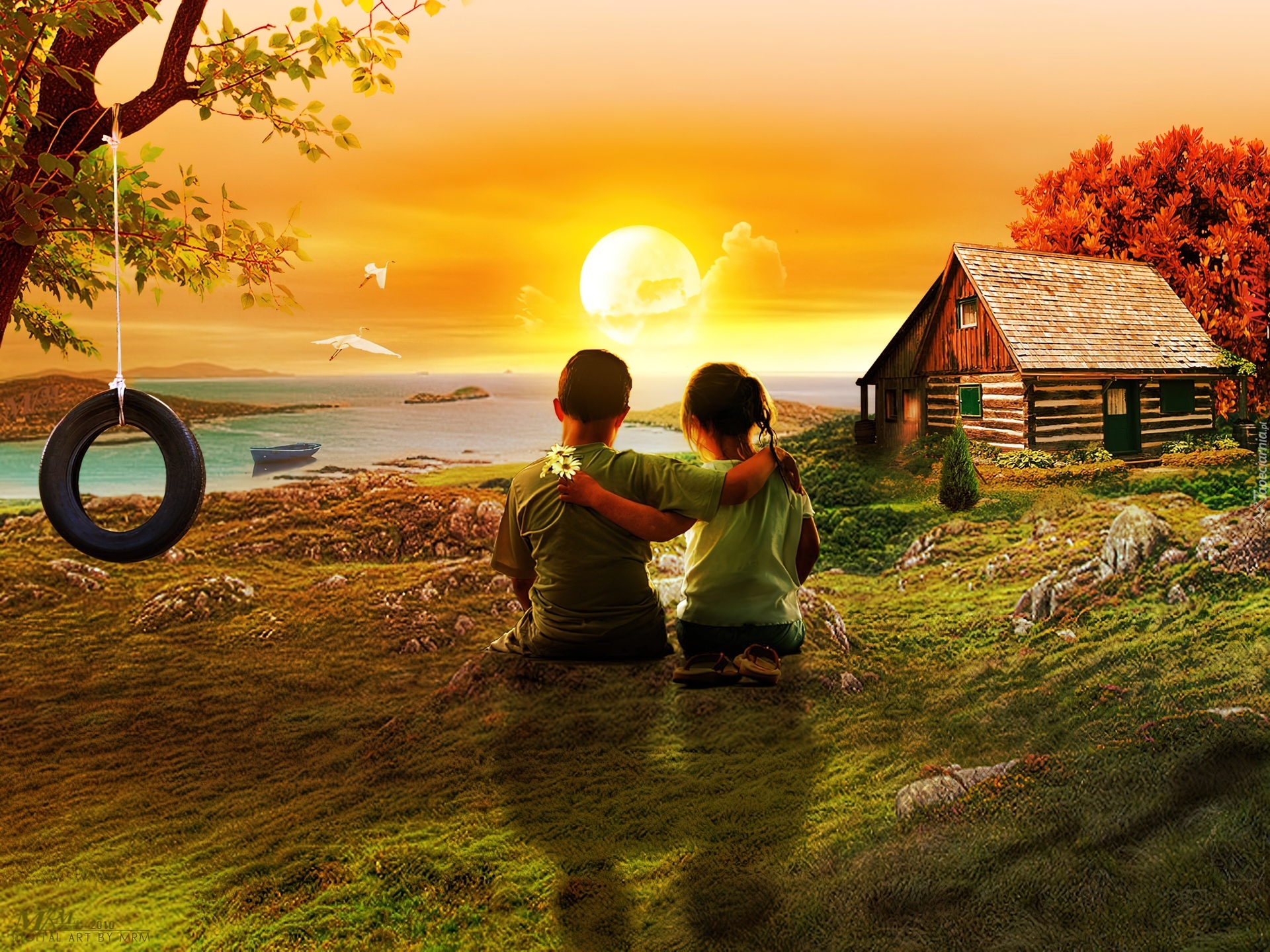Edytor tapety: Dziewczynka, Chłopiec, Zachód, Słońca