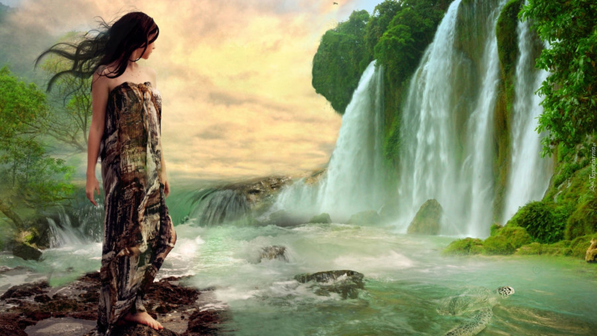 Edytor tapety: Dziewczyna, Wodospad, Żółw